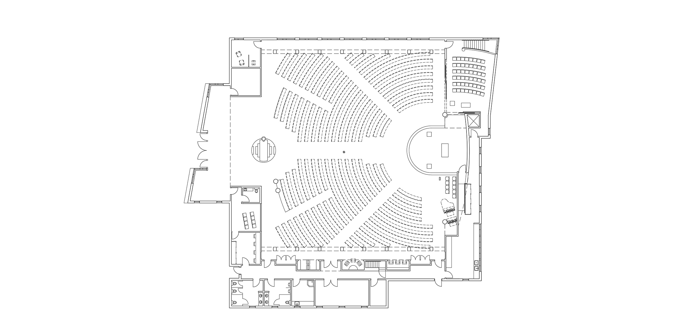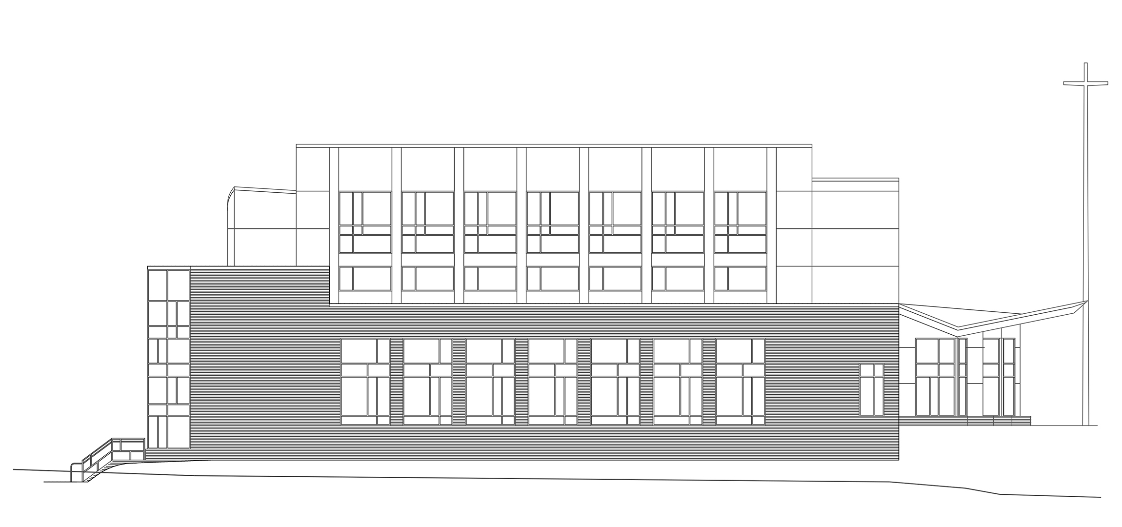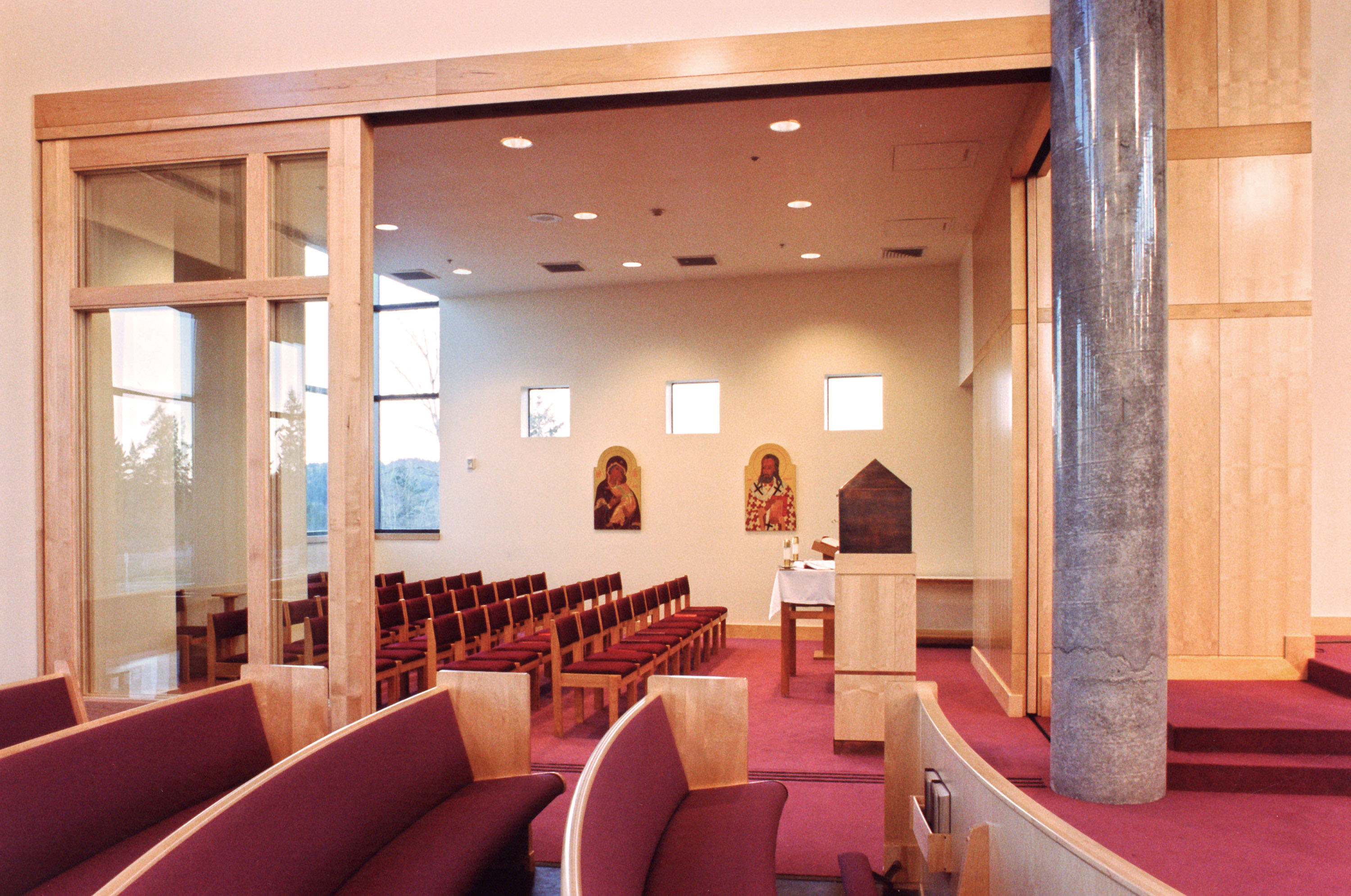 The 14,000 SF church is entered through a pair of large wood paneled doors. The narthex, separated from the main worship space by the immersion baptismal font, allows full view into the nave with its maple pews, radiused to form an amphitheater arrangement that seats 750. Four polished concrete columns support the roof allowing for a column free nave under the asymmetrical roof form. Side aisles and the central aisle lead to the raised sanctuary space. Floor to ceiling windows along the north wall give access to the distant view, while the clerestory of windows along the south wall allows sunlight to filter into the space.