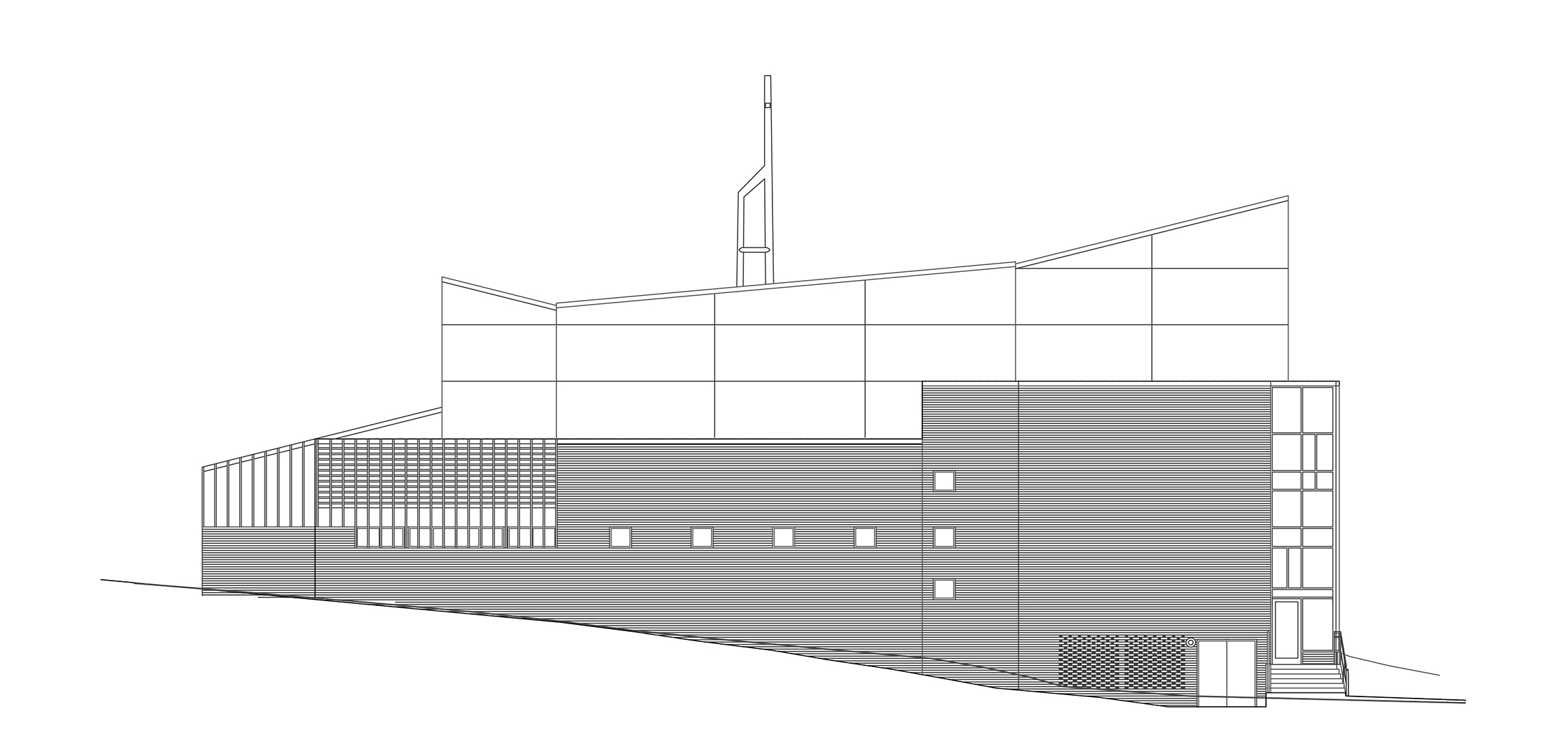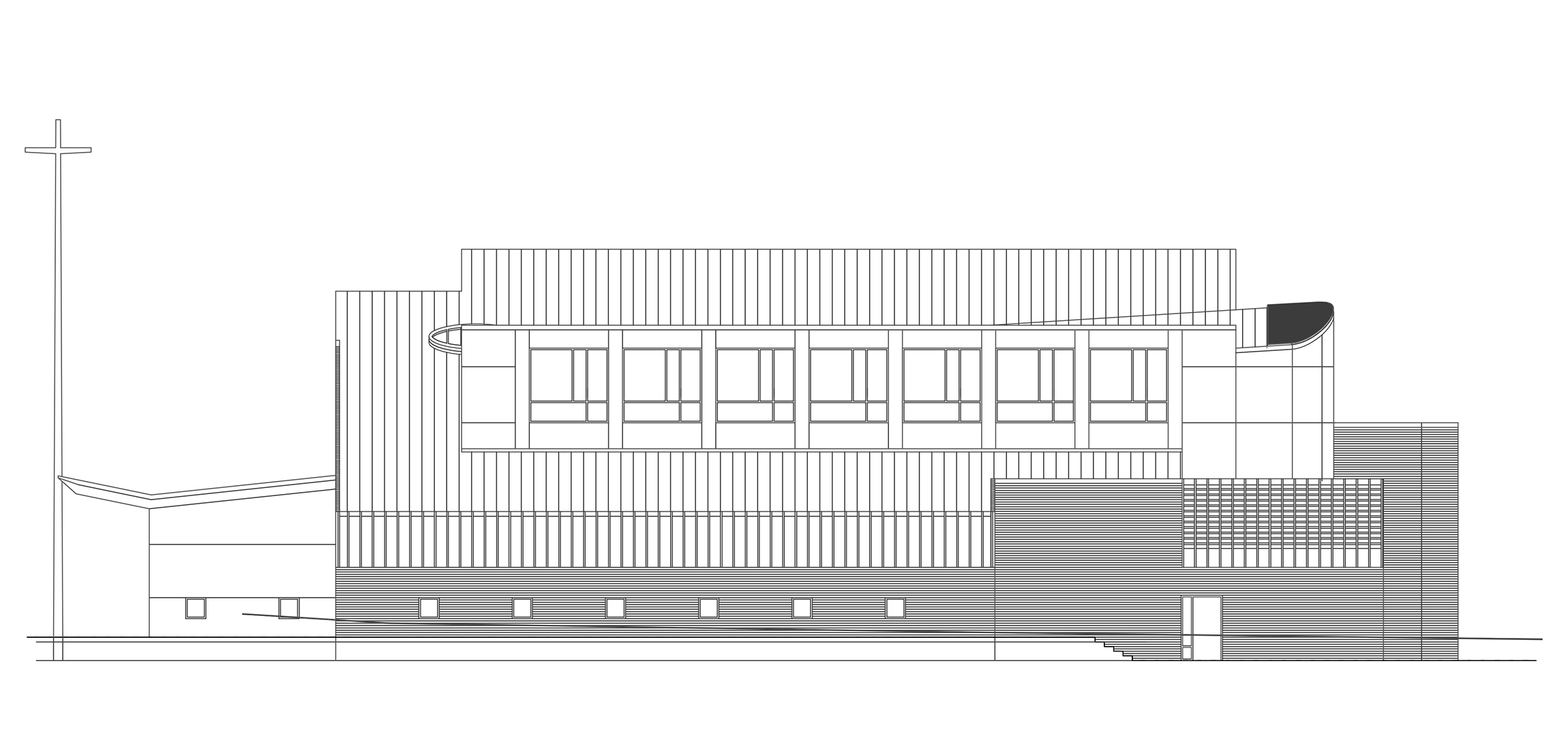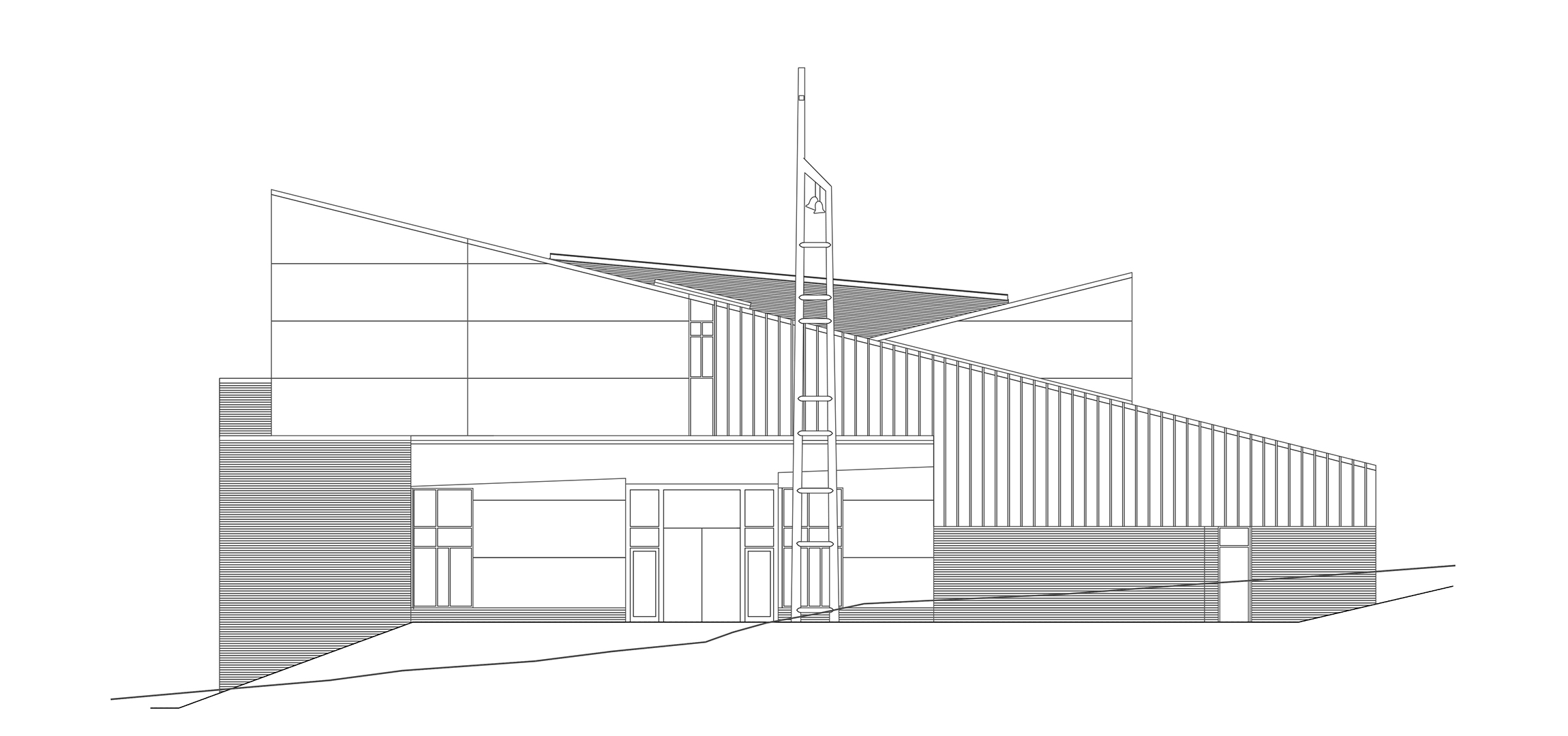 The exterior shape of the building is a direct response to forces of the site. To open the building up to the northern view beyond, the roof slopes up from the south to reach an interior height of 45 feet above the floor. A pop-up clerestory, pitched to the south, brings in sunlight and gives interior views up the hill to the evergreens outside. Finally, to insure that the space is high over the altar, the roof slopes up from the entry to a skylight high above the sanctuary space below. From the interior the dynamic roof appears to take flight in three directions; but from the outside the appearance of a simple single pitched roof is dominant. Finally, the building is wrapped in masonry, cedar board and batten, and stucco. These materials are used on the exterior to link the building to a northwest tradition of architecture. Ultimately, it’s that connection to the Pacific Northwest that gives this structure a sense of timeless design.