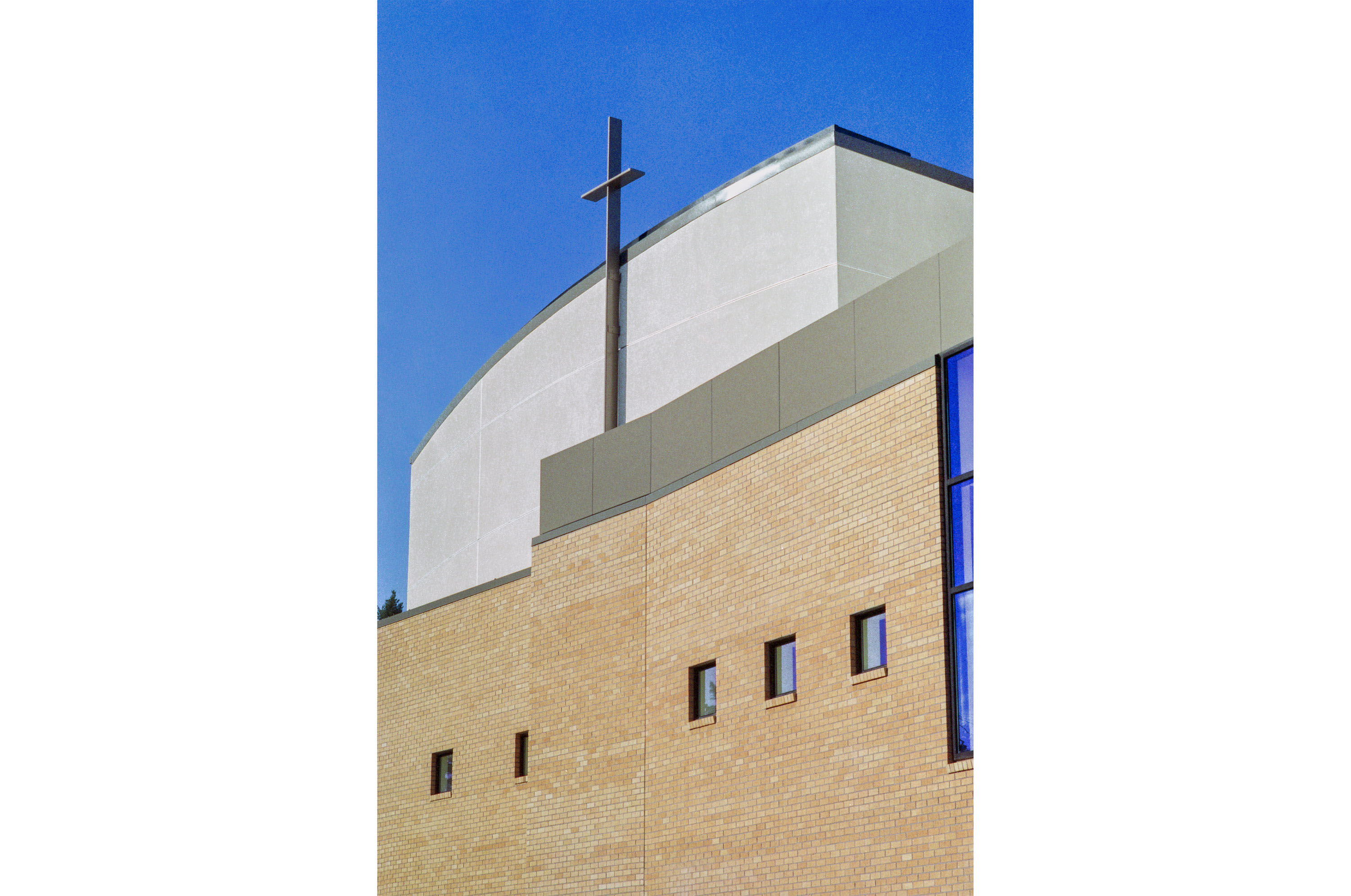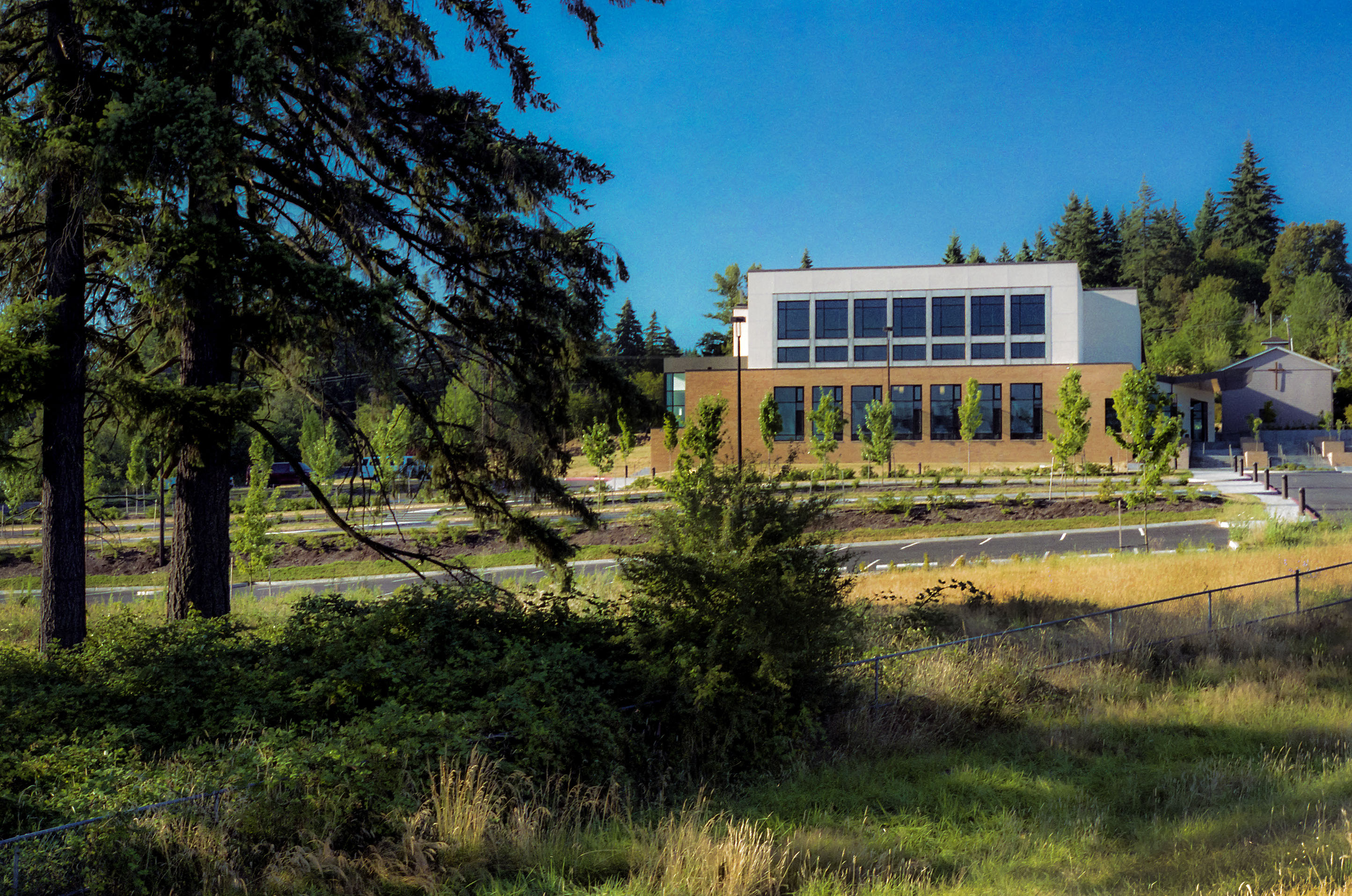 The Catholic Church of the Resurrection, clearly visible from I-205, is the culmination of over a decade of planning and design. The parish had been worshiping in a renovated horse stable. The new church created a community landmark and solved the need for a larger and more permanent place to worship.
