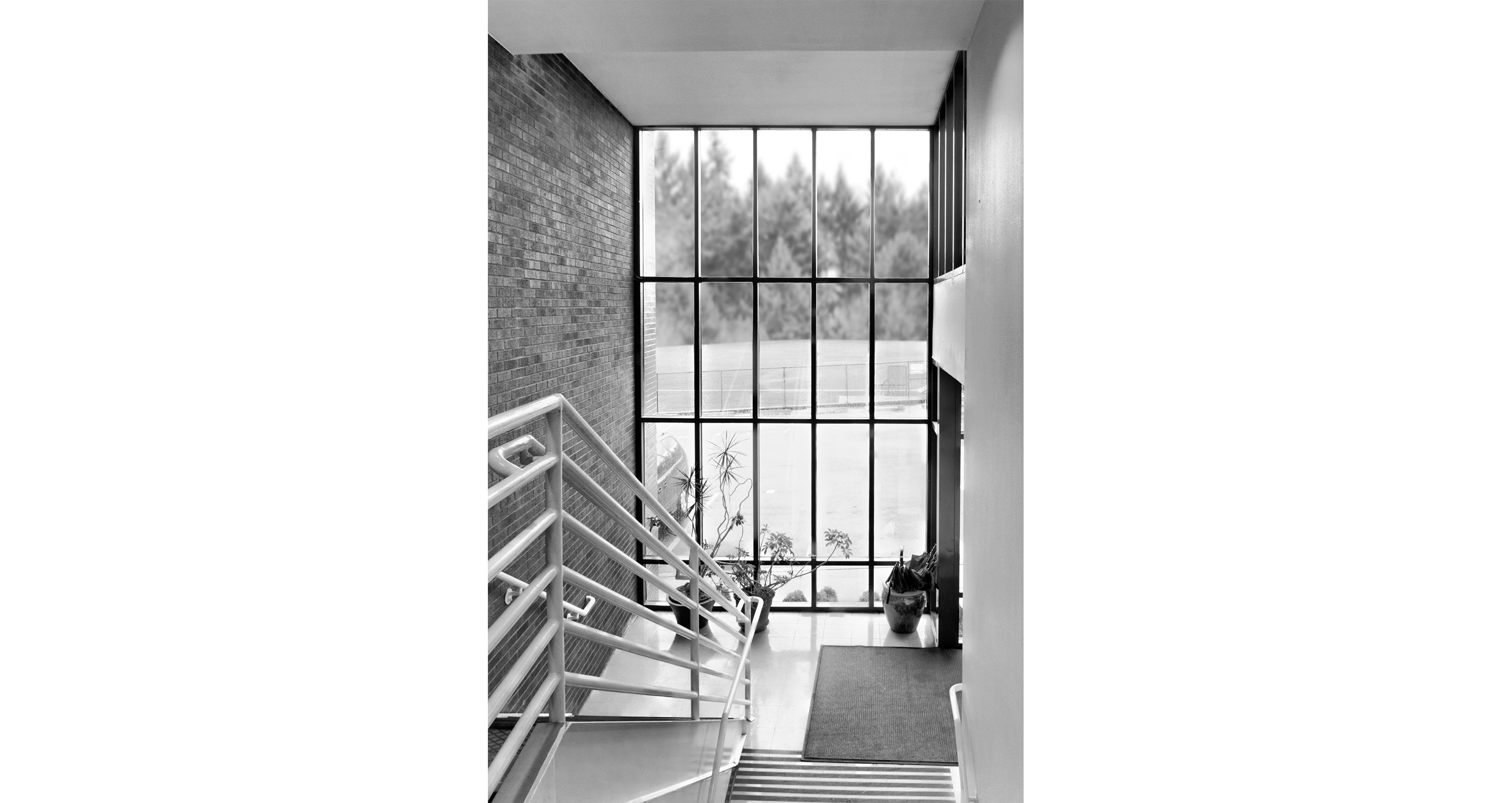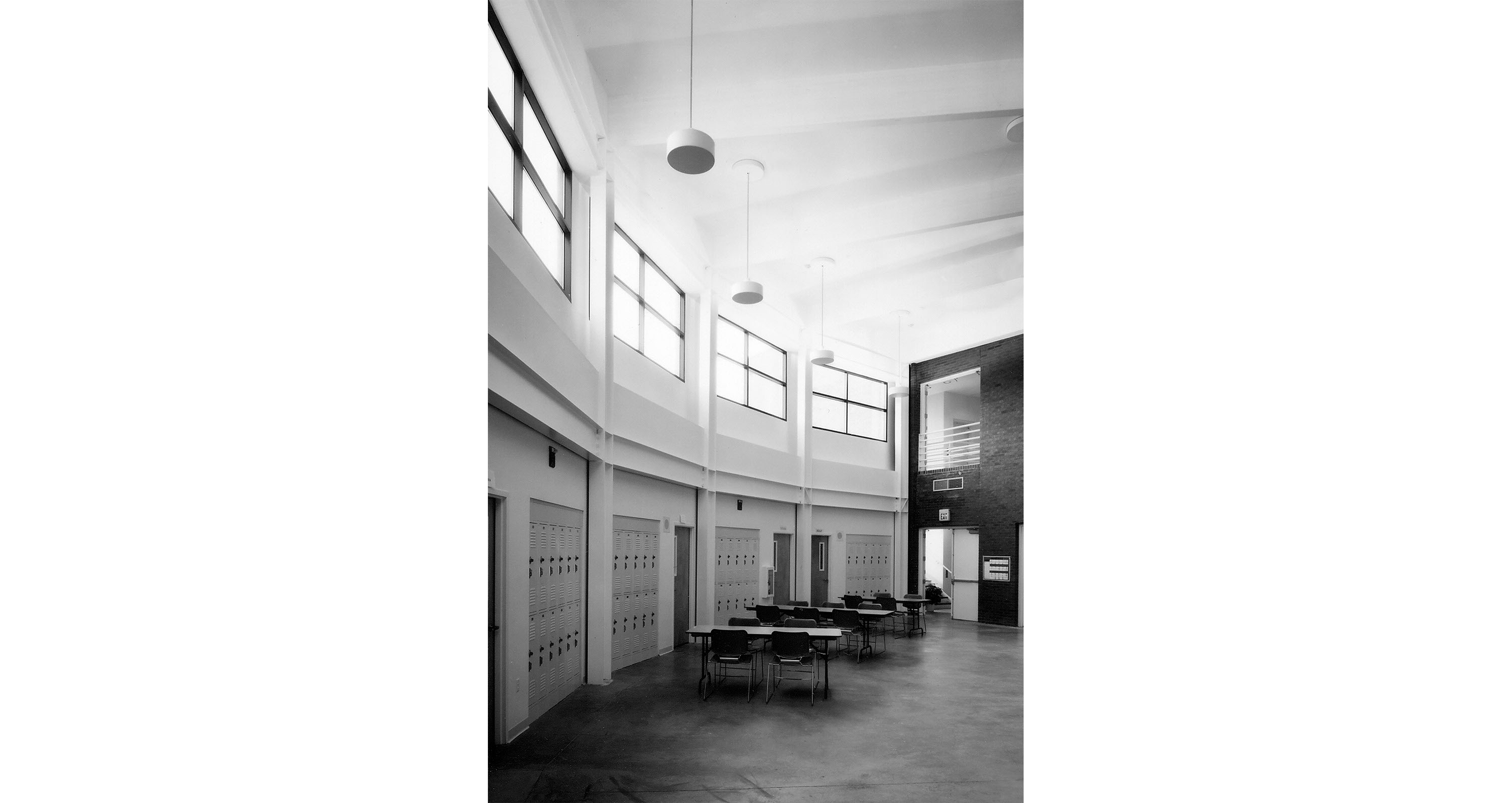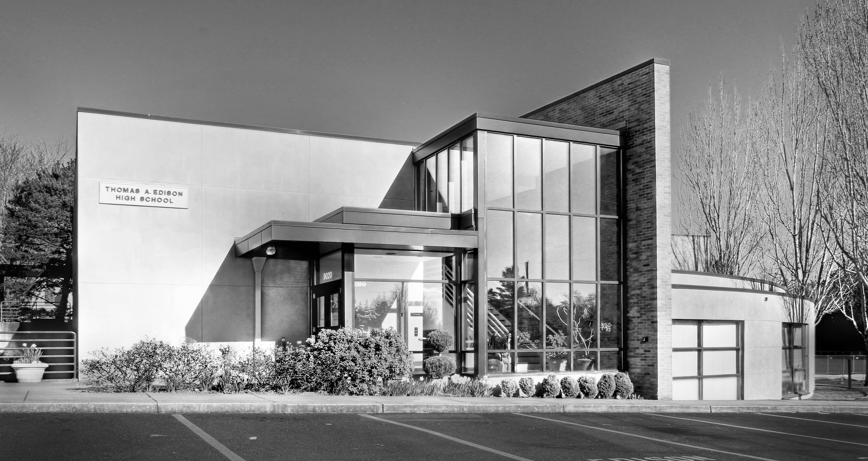 Thomas A. Edison High School is an alternative school devoted to helping students with learning challenges succeed. The building serves a small student body and is located on the campus of an existing private high school. Because of the school’s physical setting and its extraordinary mission, the building is designed with the school’s intimate, community-oriented tradition in mind. To foster a sense of togetherness and community, the building is arranged around a large room where all staff and students gather once each day. Surrounding this space and radiating from it are classrooms, administration and support spaces. The building plan encourages student to student and student to teacher contact. Hallways are designed for loitering and the access to classrooms is through the central two story gathering space.