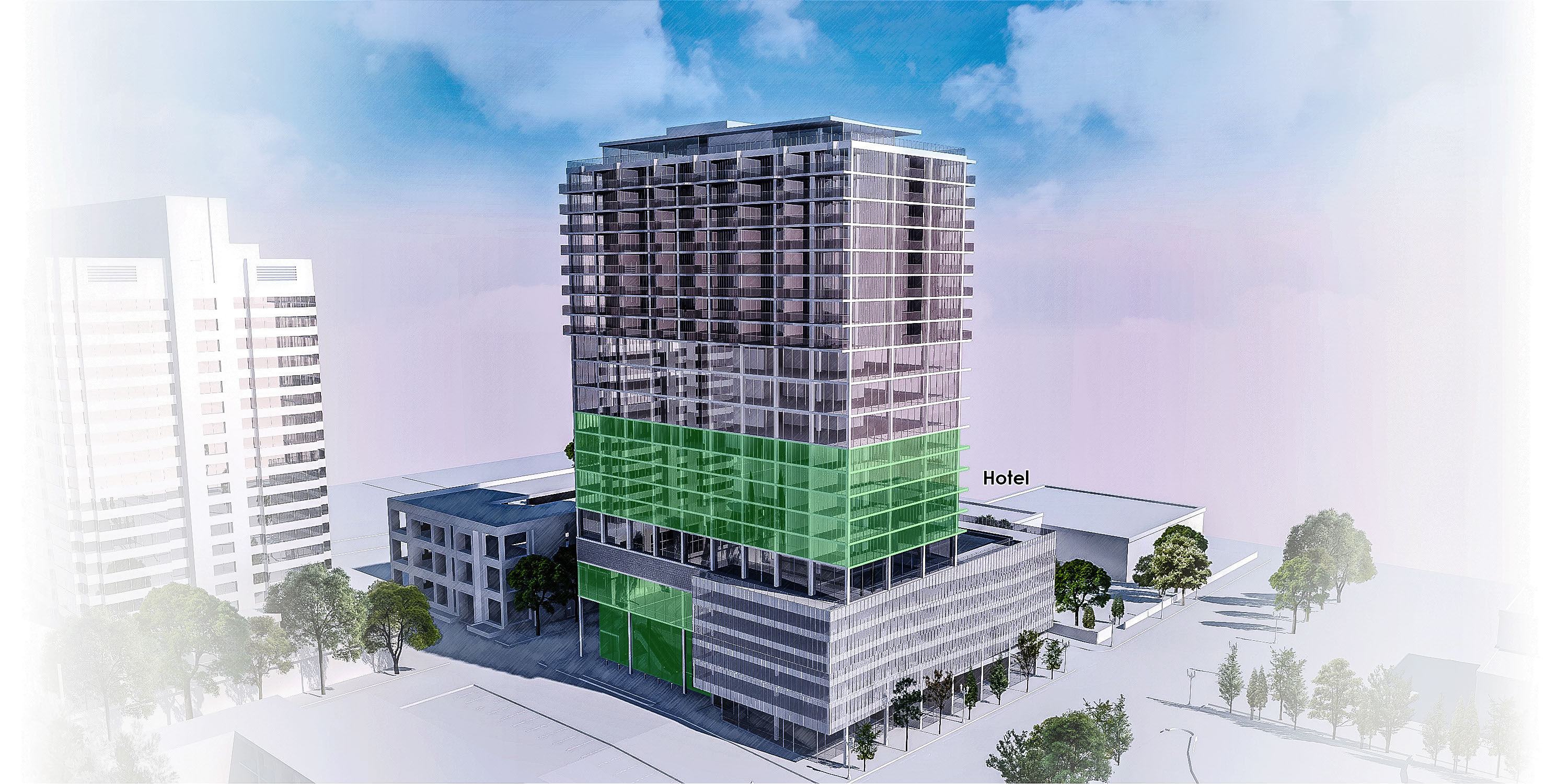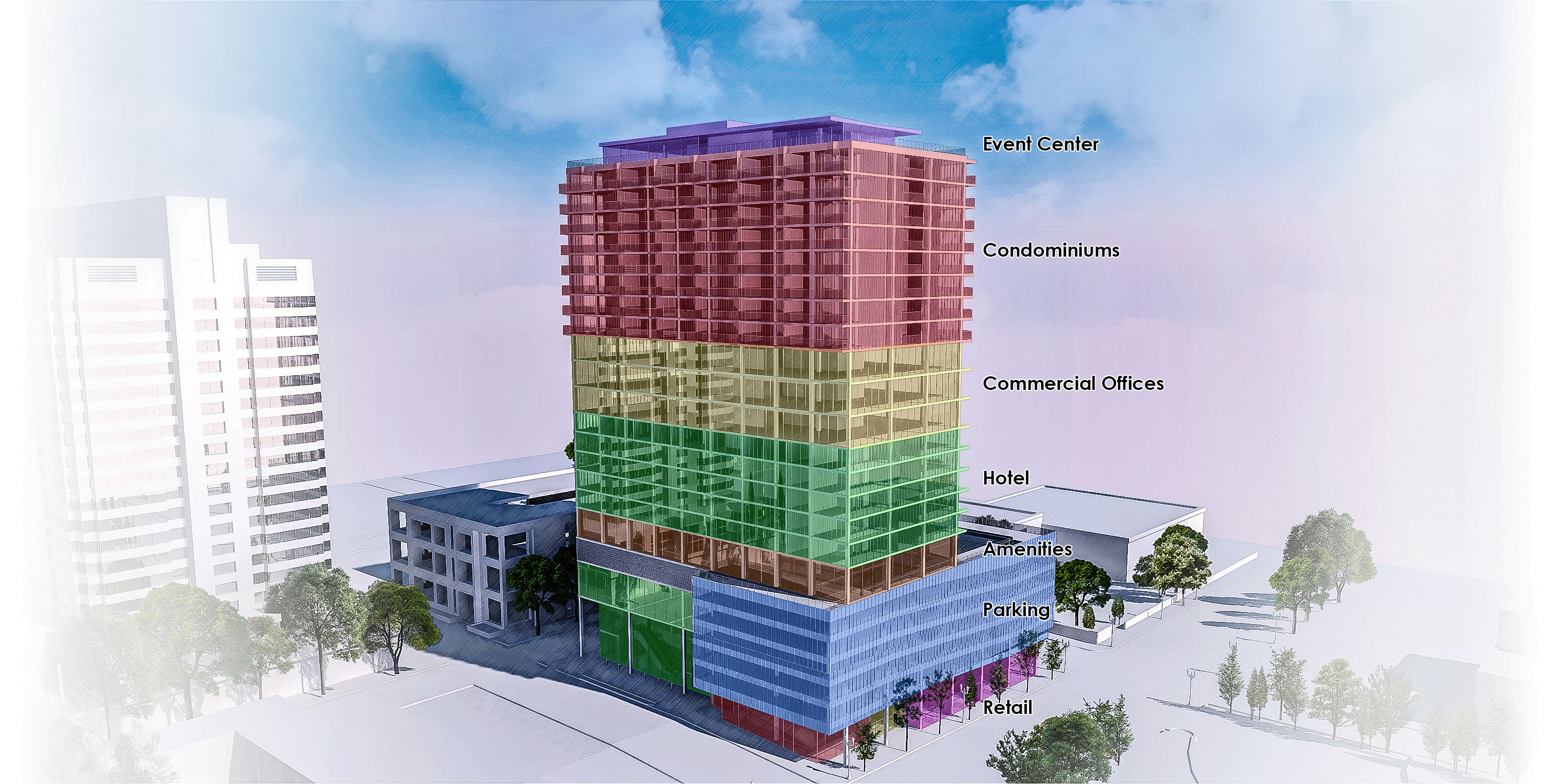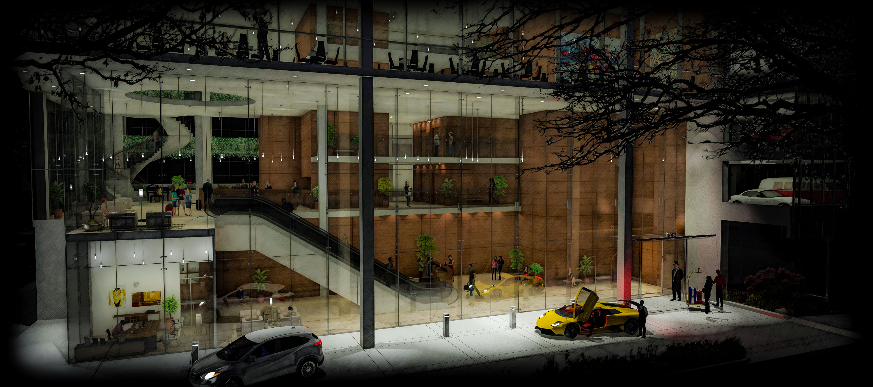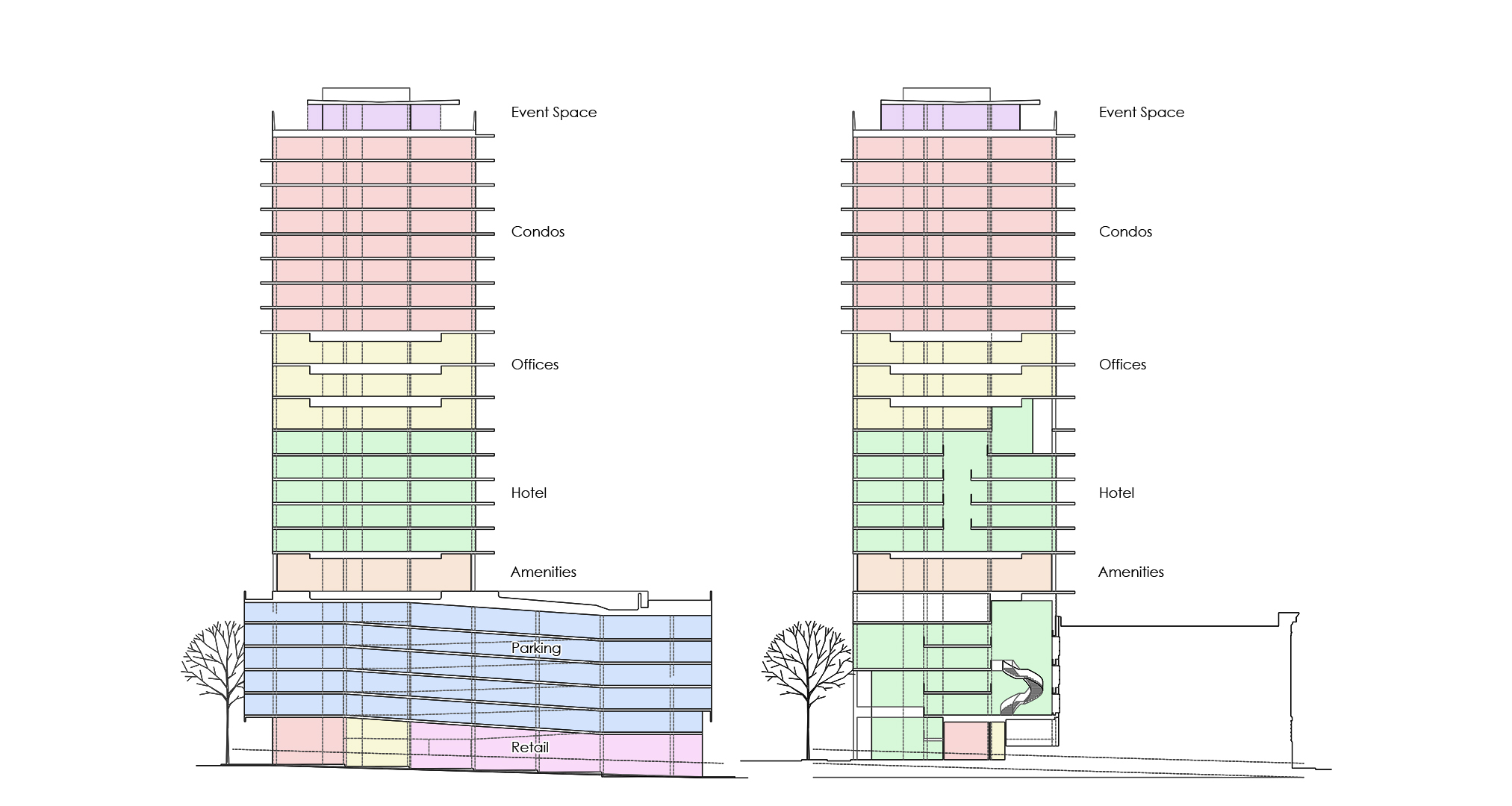 The pedestrian experience means foot traffic to all uses from the ground. Along the main street, retail with separate entry points for condos and offices respectively. On the side street, a destination hotel’s lobby whose escalator ascends to its 5 story gardened atrium; a further spiral stair leads to its restaurant. 5 floors of parking perch above the retail to keep activity free-moving and unimpeded. A destination dispatch elevator system to the roof top event space, amenities floor, and to the office and condo levels, likewise keep traffic flow efficient and comprehendible.