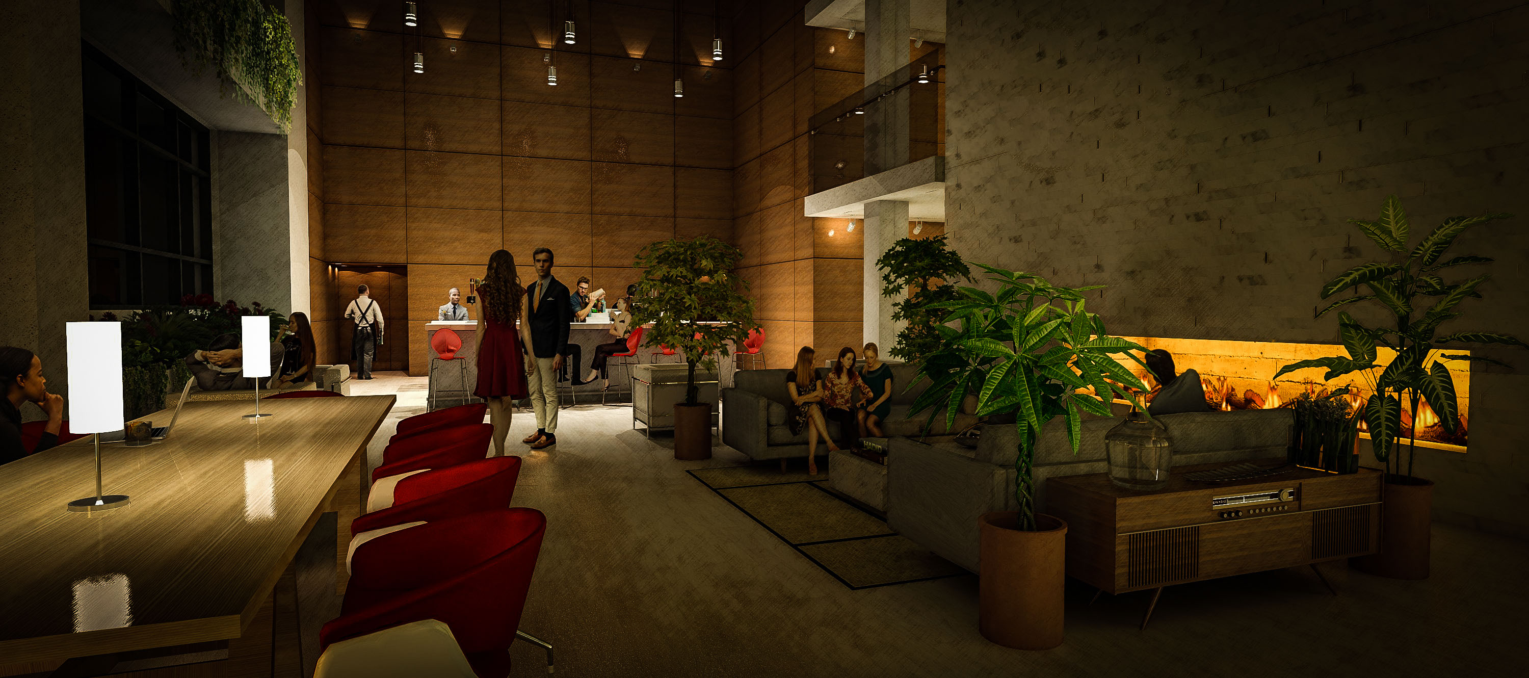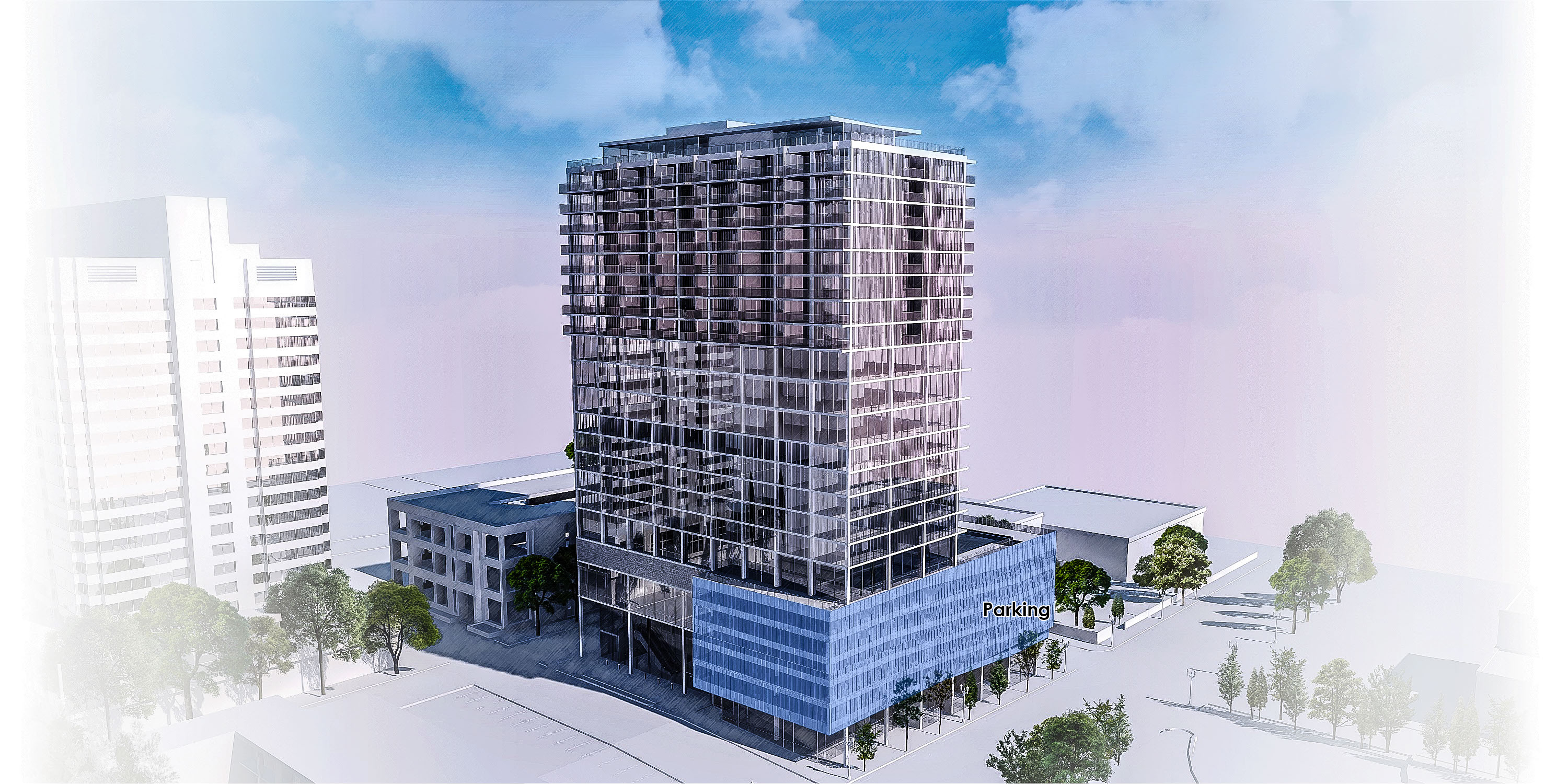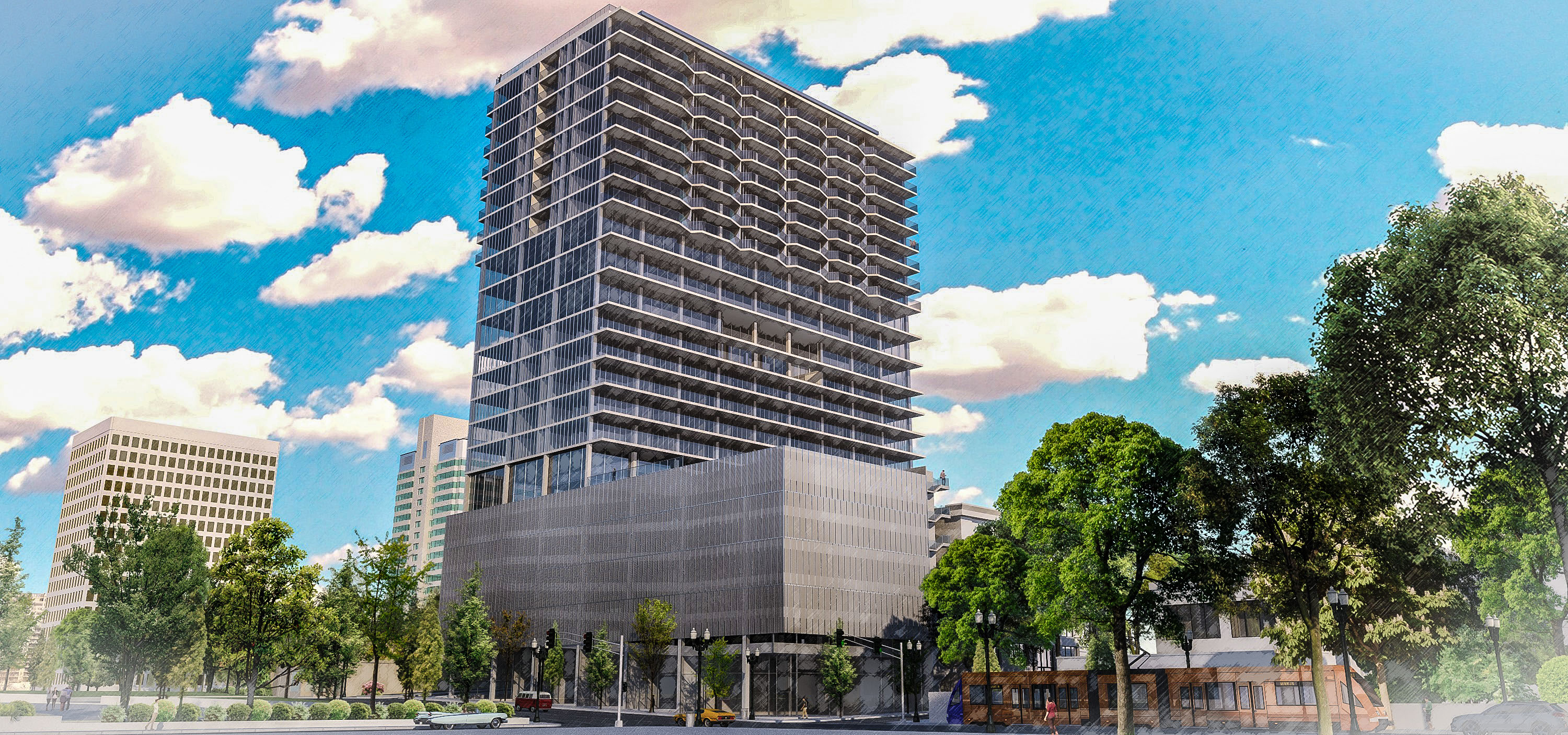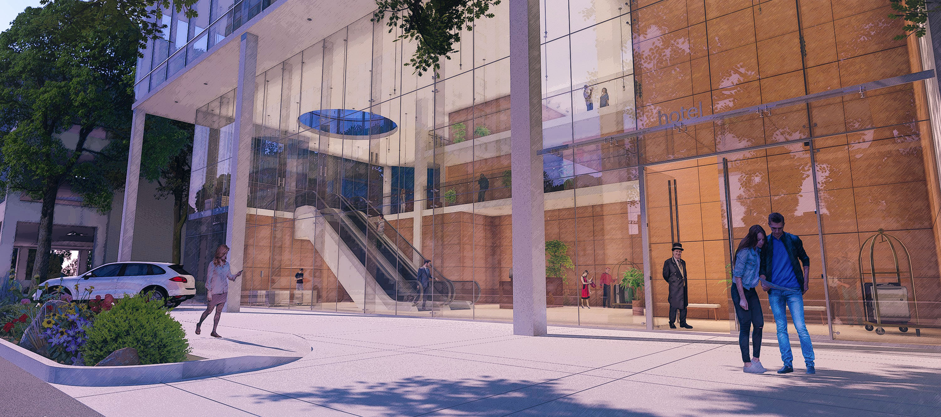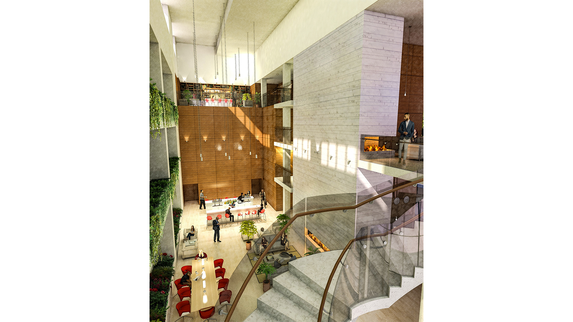 The pedestrian experience means foot traffic to all uses from the ground. Along the main street, retail with separate entry points for condos and offices respectively. On the side street, a destination hotel’s lobby whose escalator ascends to its 5 story gardened atrium; a further spiral stair leads to its restaurant. 5 floors of parking perch above the retail to keep activity free-moving and unimpeded. A destination dispatch elevator system to the roof top event space, amenities floor, and to the office and condo levels, likewise keep traffic flow efficient and comprehendible.