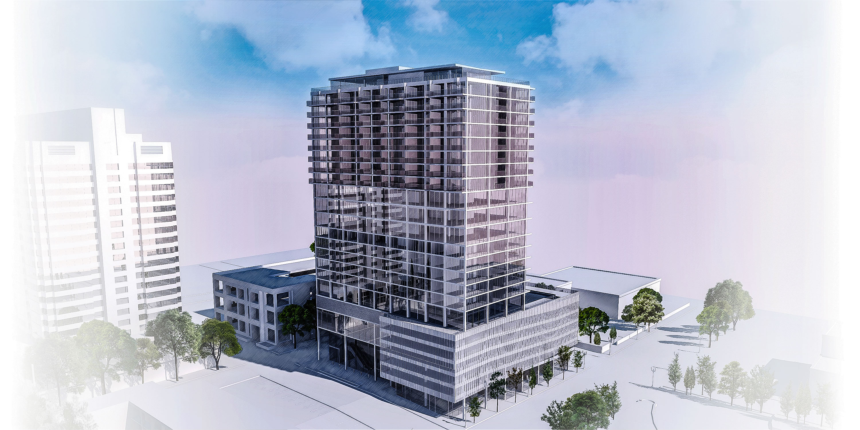 The Forum Tower in Lloyd, is extolled density. 6 uses in a single structure in the heart of a growing neighborhood in the center of town. 84 condos, 120 hotel rooms, 260 car stalls, 38,000 ft2 of office space, 7500 ft2 of retail and an event space for over 230 people; in 24 stories with not even a full lot for a footprint. Our client tasked us with the development design on a block on which they already owned an existing quarter-lot, mid-rise building erected 100 years ago. We had the remaining three-quarter lot to partner 2020 with 1920 and create a multi-use, active building, constructed for a modern populace.