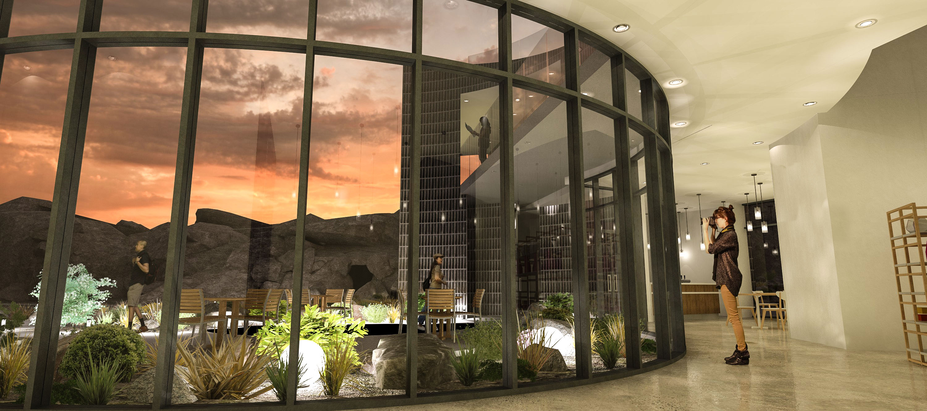 The simple form of the building is a continuous planted roof spiraling up to a high outdoor terrace at the spiral’s apex. To blend into the landscape and survive the harsh environment the building is covered in large panels of black ceramic tiles. Inside, a small kitchen, café, gift shop, gallery and lecture room are arranged in the circular plan around the outdoor courtyard.