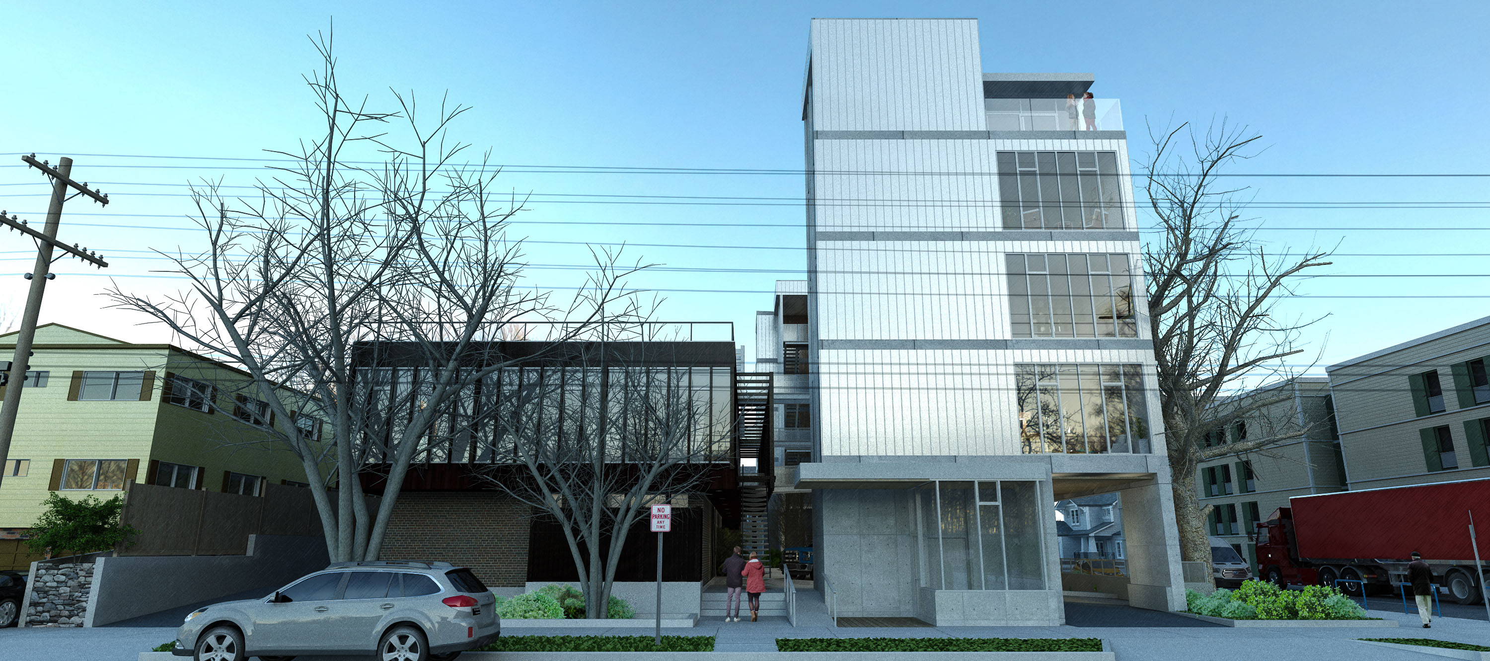 We believe in urban density. We think that our cities should condense so that our nature might sprawl. The L.I.A is a chance to, as it’s said, put our money where our mouth is. On a relatively small site with an existing office building and parking lot, we’ve planned a 5 story structure for 19 units. The twist? DiLoreto Architecture is a tenant in the existing office building. Yet we ourselves brought this notion of density to the owner and it is a chance for us to prove its tenability.