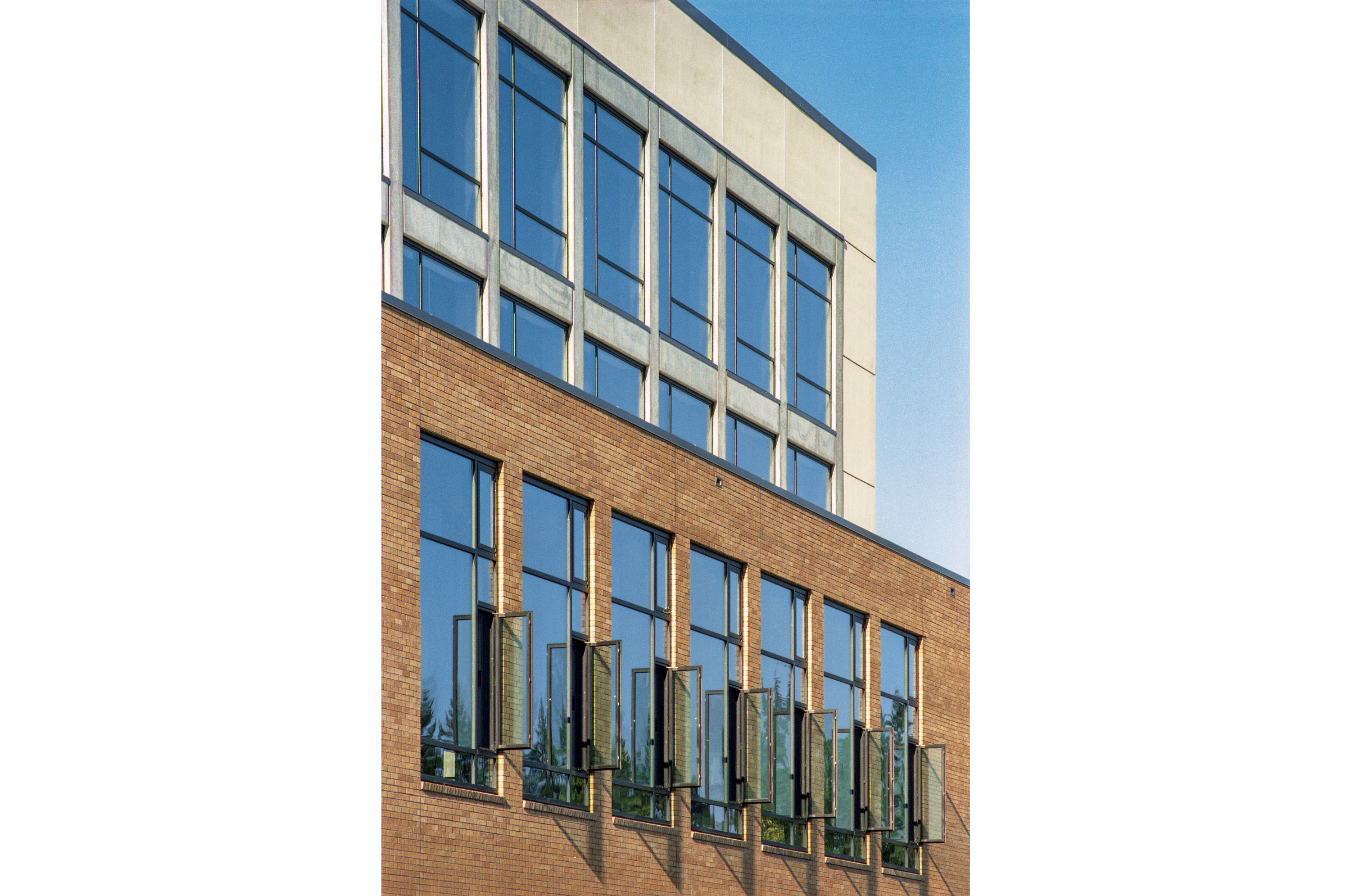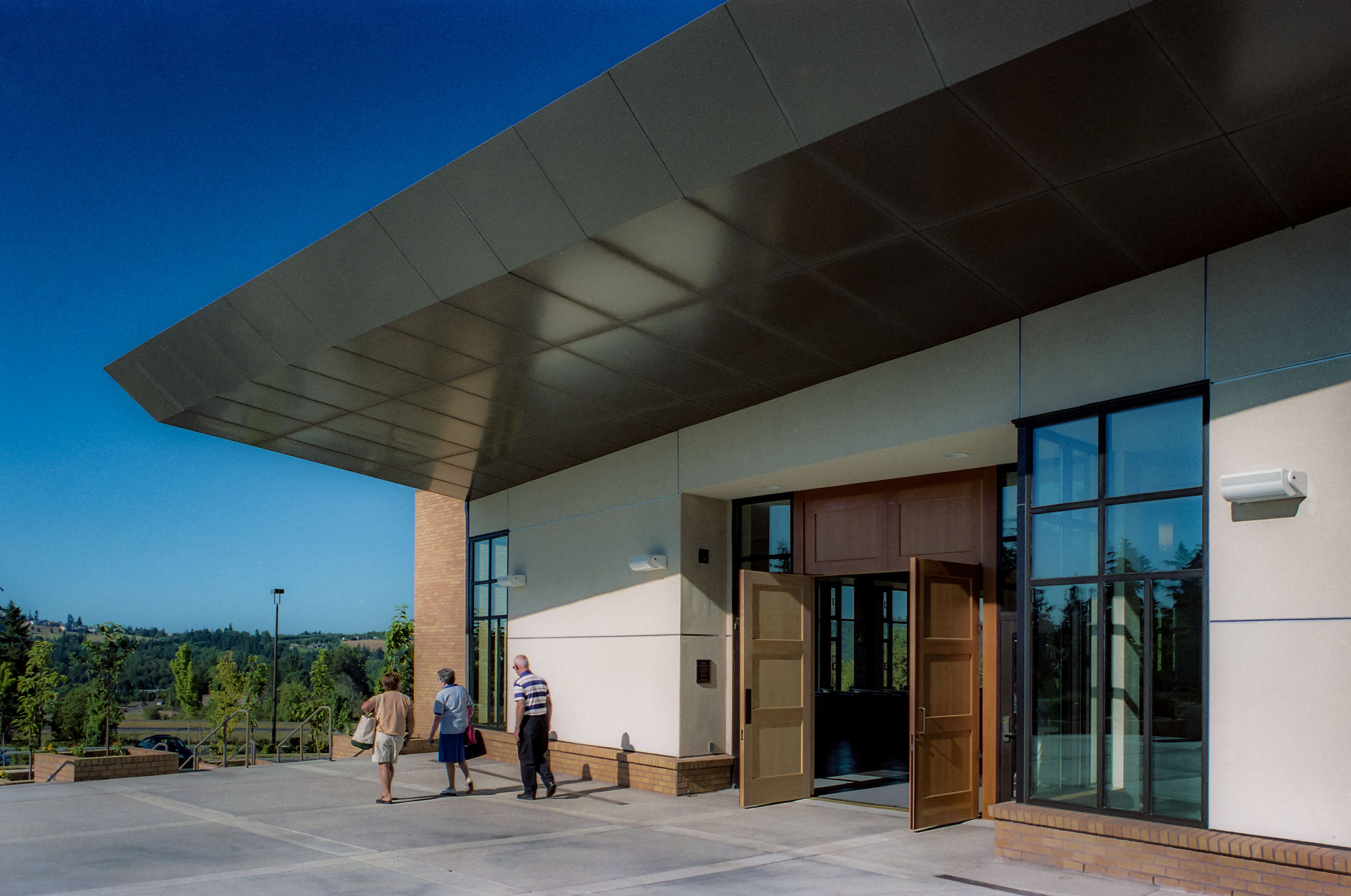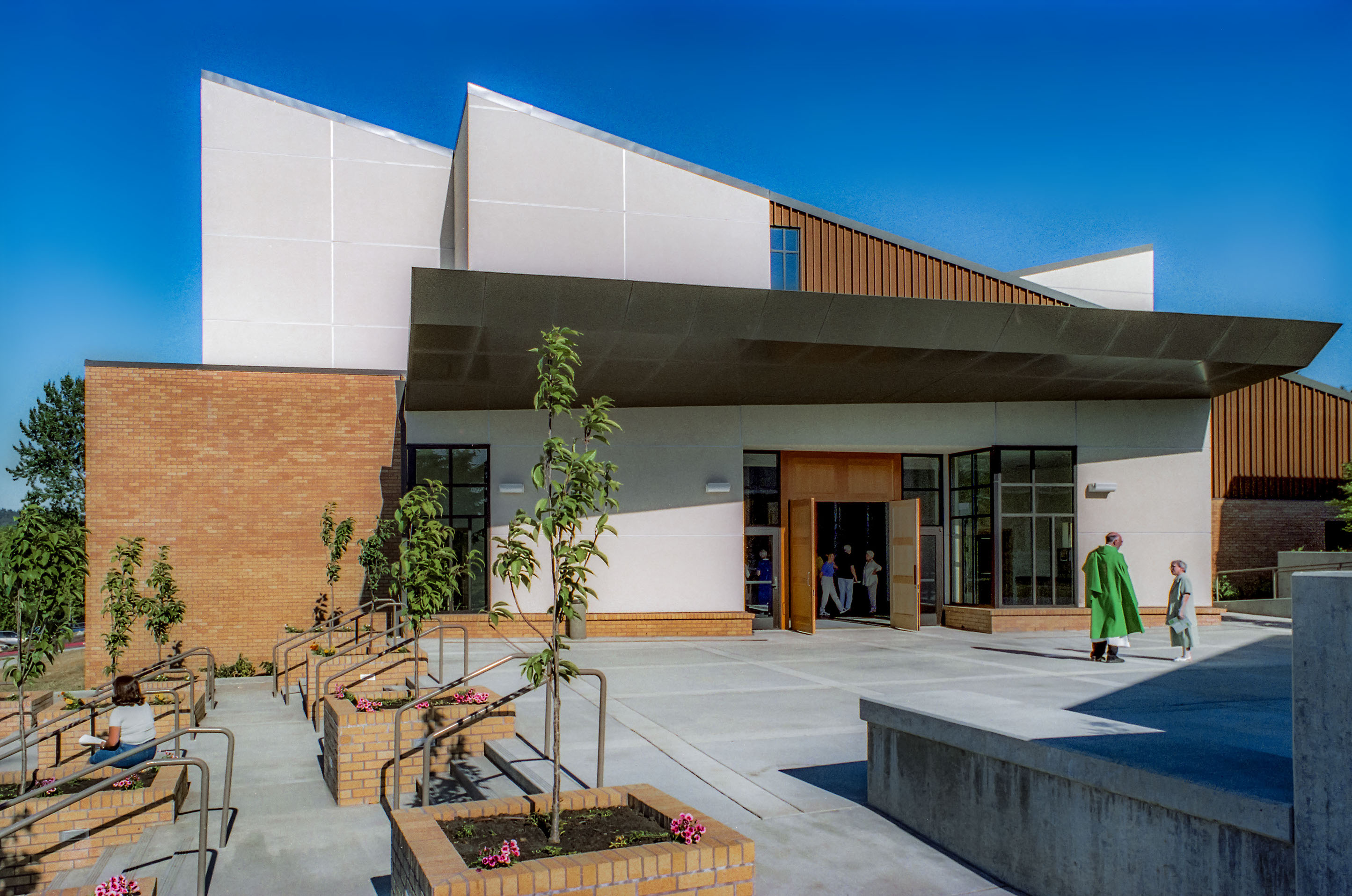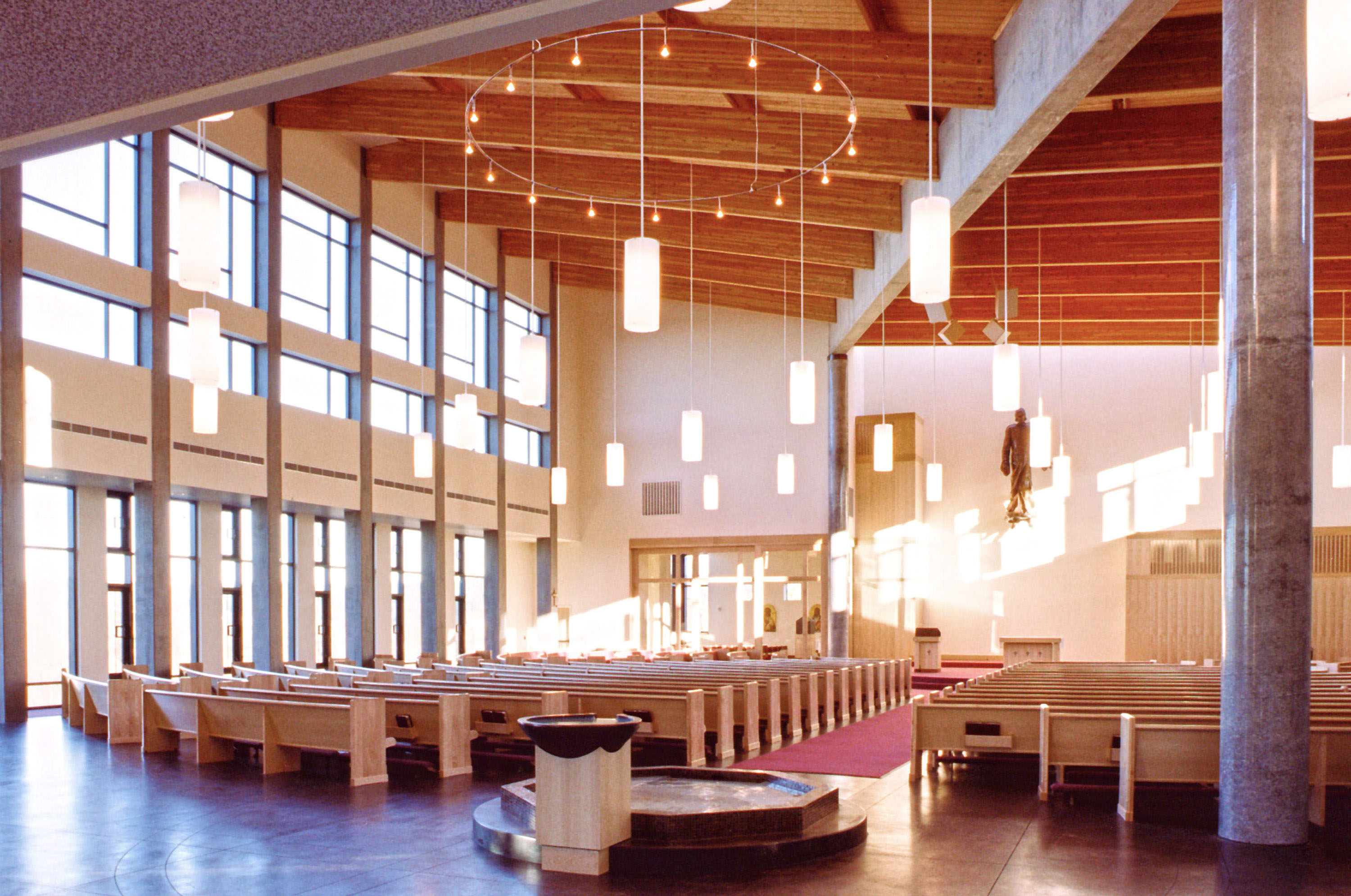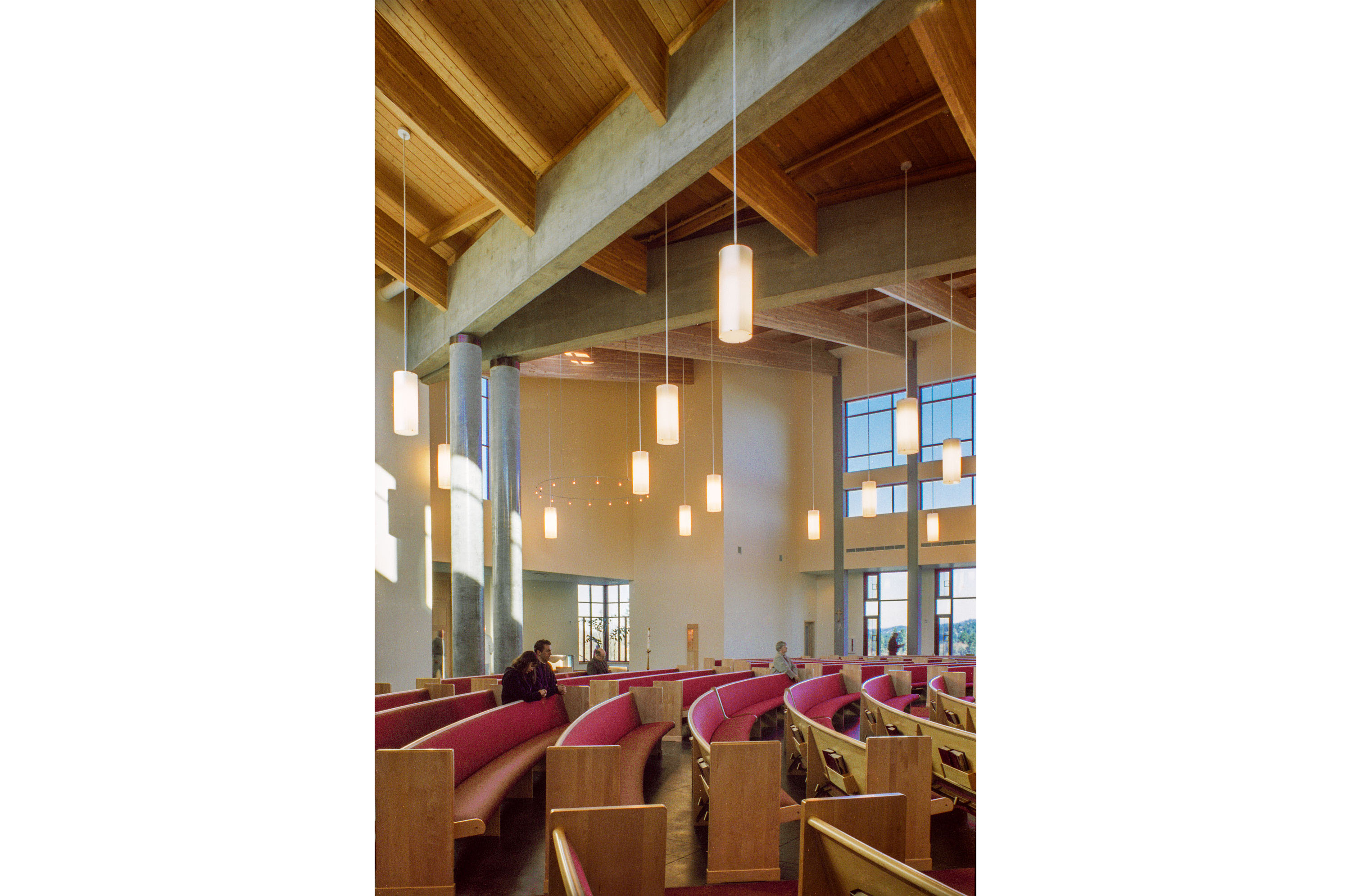 The Catholic Church of the Resurrection is the culmination of over a decade of planning and design. The exterior shape of the building is a direct response to forces of the site. To open the building up to the northern view beyond, the roof slopes up from the south to reach an interior height of 45 feet above the floor. A pop-up clerestory, pitched to the south, brings in sunlight and gives interior views up the hill to the evergreens outside. Finally, to insure that the space is high over the altar, the roof slopes up from the entry to a skylight high above the sanctuary space below. From the interior the dynamic roof appears to take flight in three directions; but from the outside the appearance of a simple single pitched roof is dominant. Finally, the building is wrapped in masonry, cedar board and batten, and stucco. These materials are used on the exterior to link the building to a northwest tradition of architecture. Ultimately, it’s that connection to the Pacific Northwest that gives this structure a sense of timeless design.