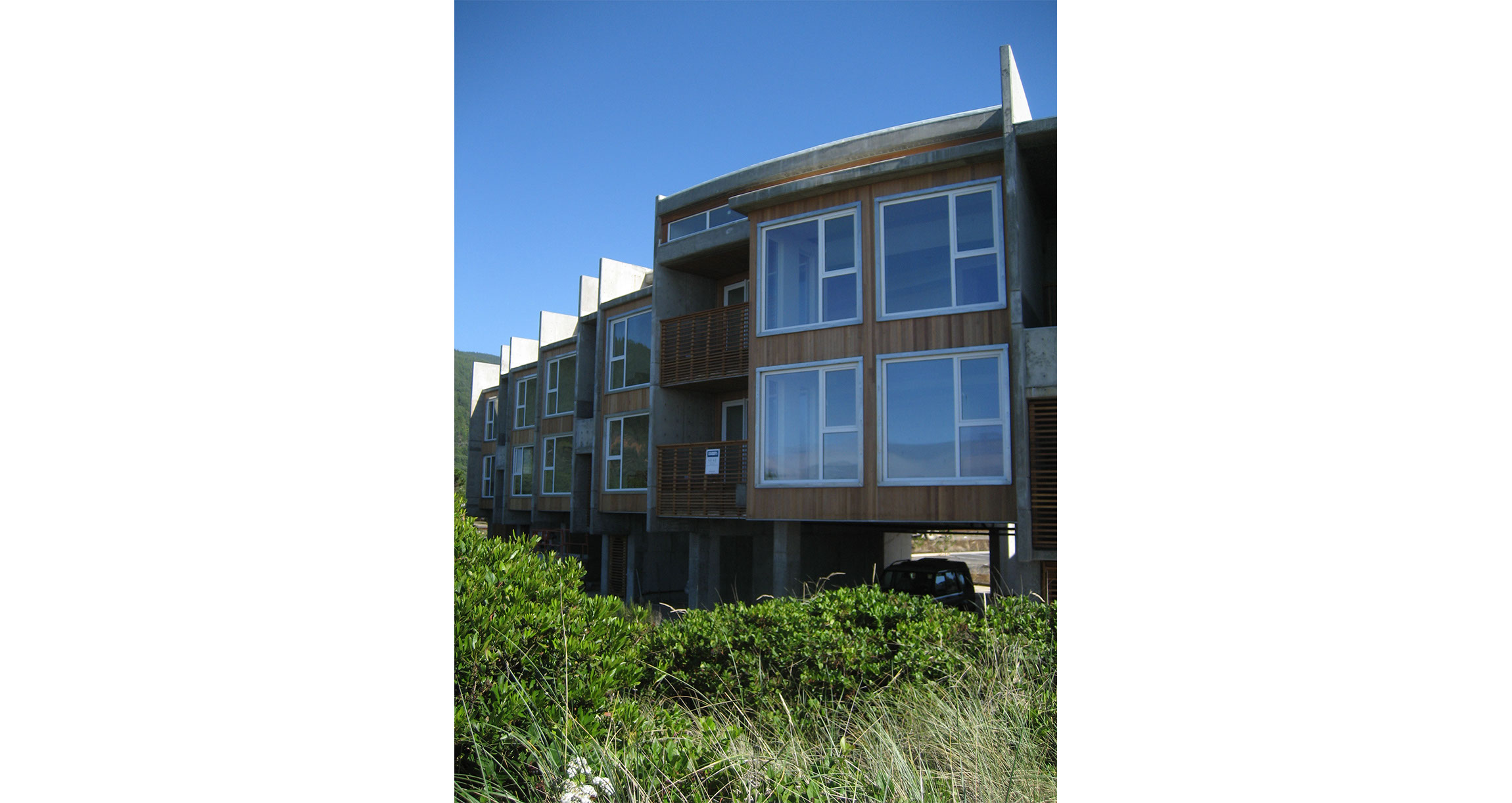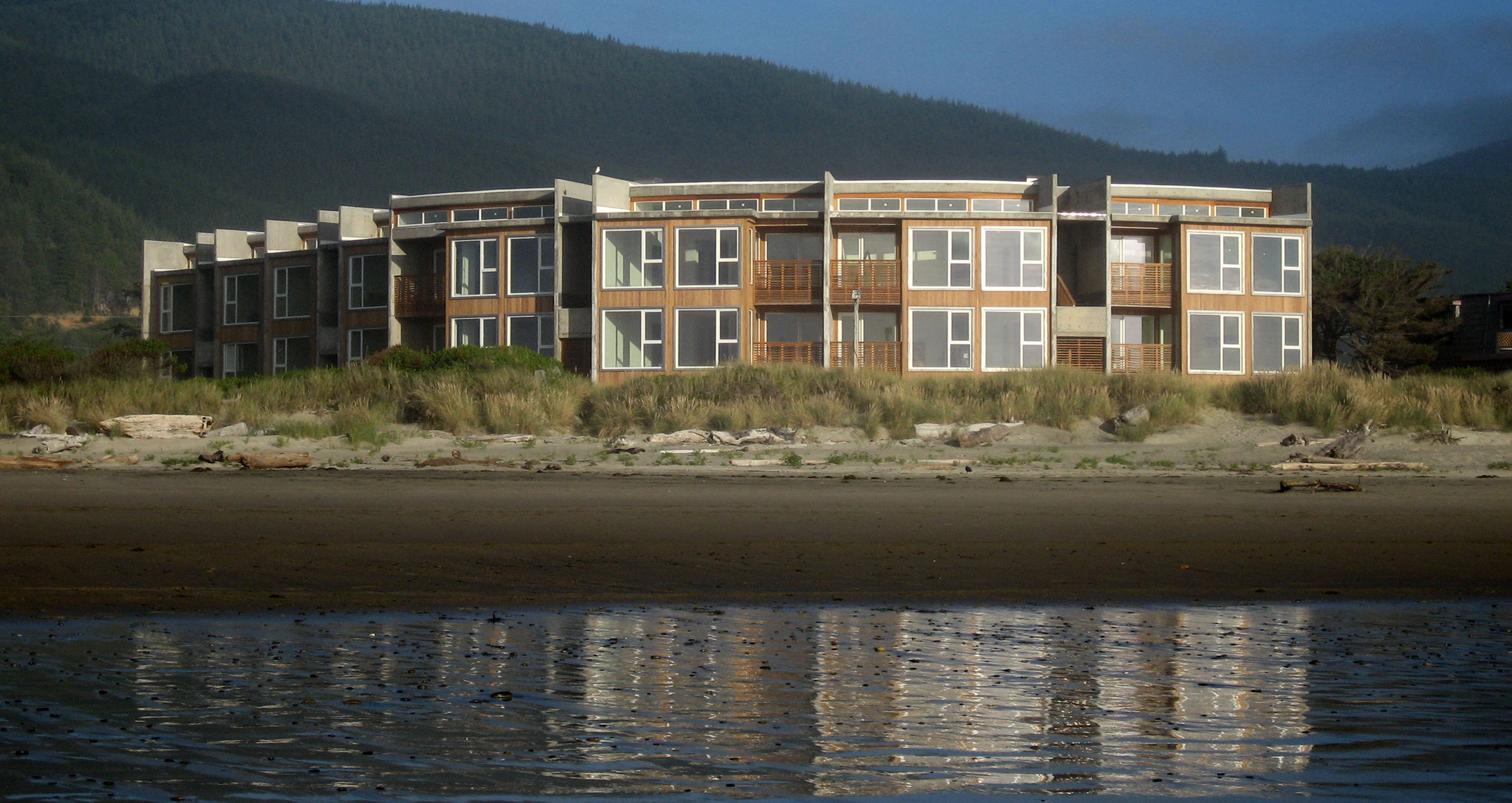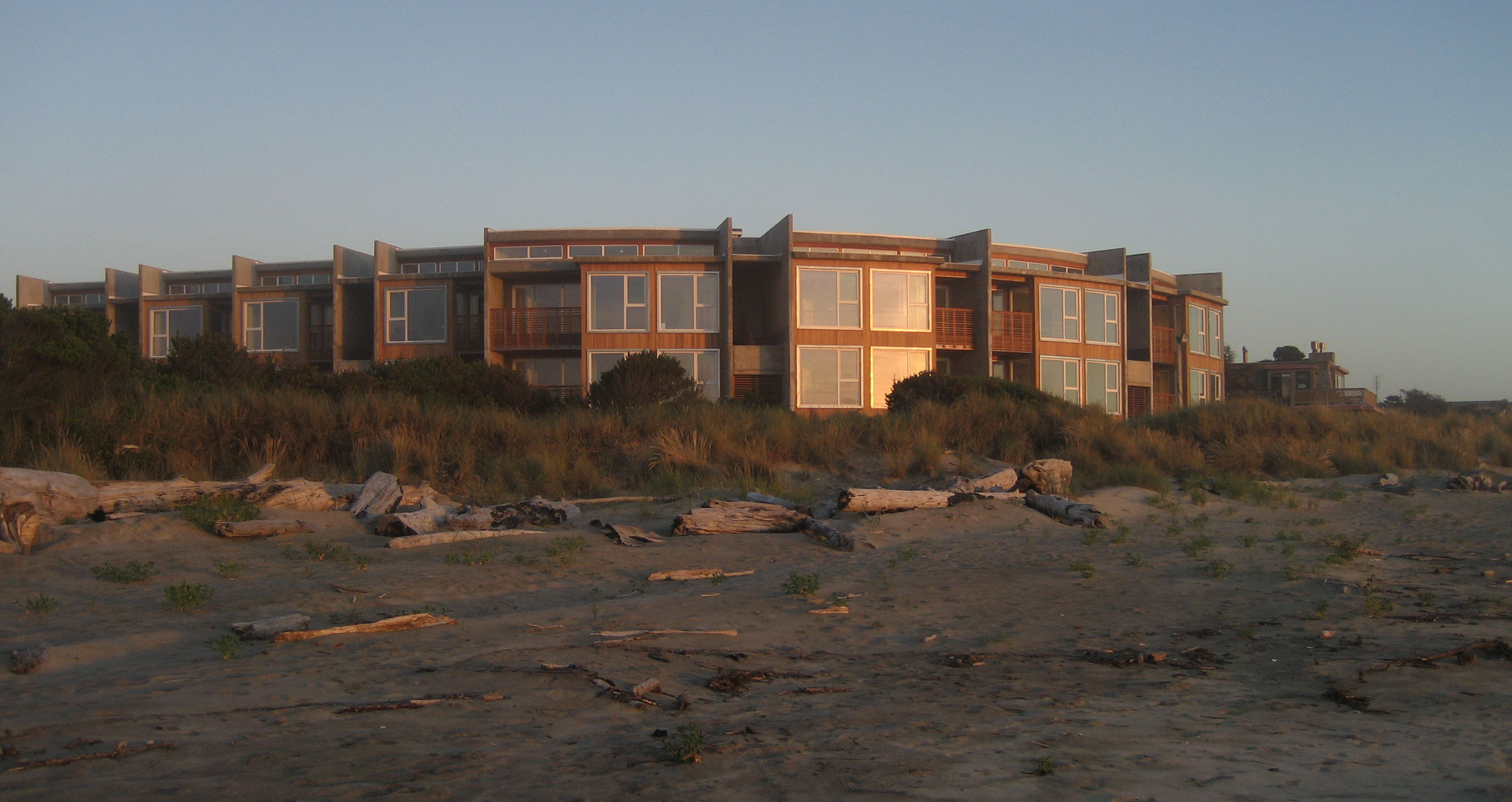 Manhattan Beach Condominiums are located on an ocean front property in Rockaway Beach, Oregon. The project had to overcome floodplain and local height restrictions to meet the owner’s requirements for sixteen units with parking, constructed in a sustainable manner overlooking the ocean. A state park to the north allows for long term unfettered ocean views along the west and north edges of the site. Access is from the east along Highway 101, the coastal highway that runs the length of the State. Fan shaped to fit the site setback requirements and for better view capability, the building sits against the west and north edges of the property while a storm water bioswale and car access fill the rest of the site.