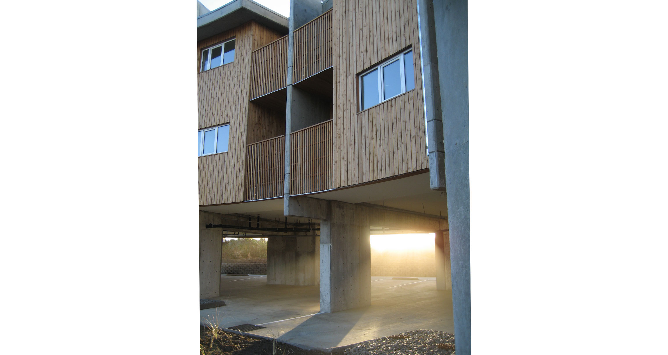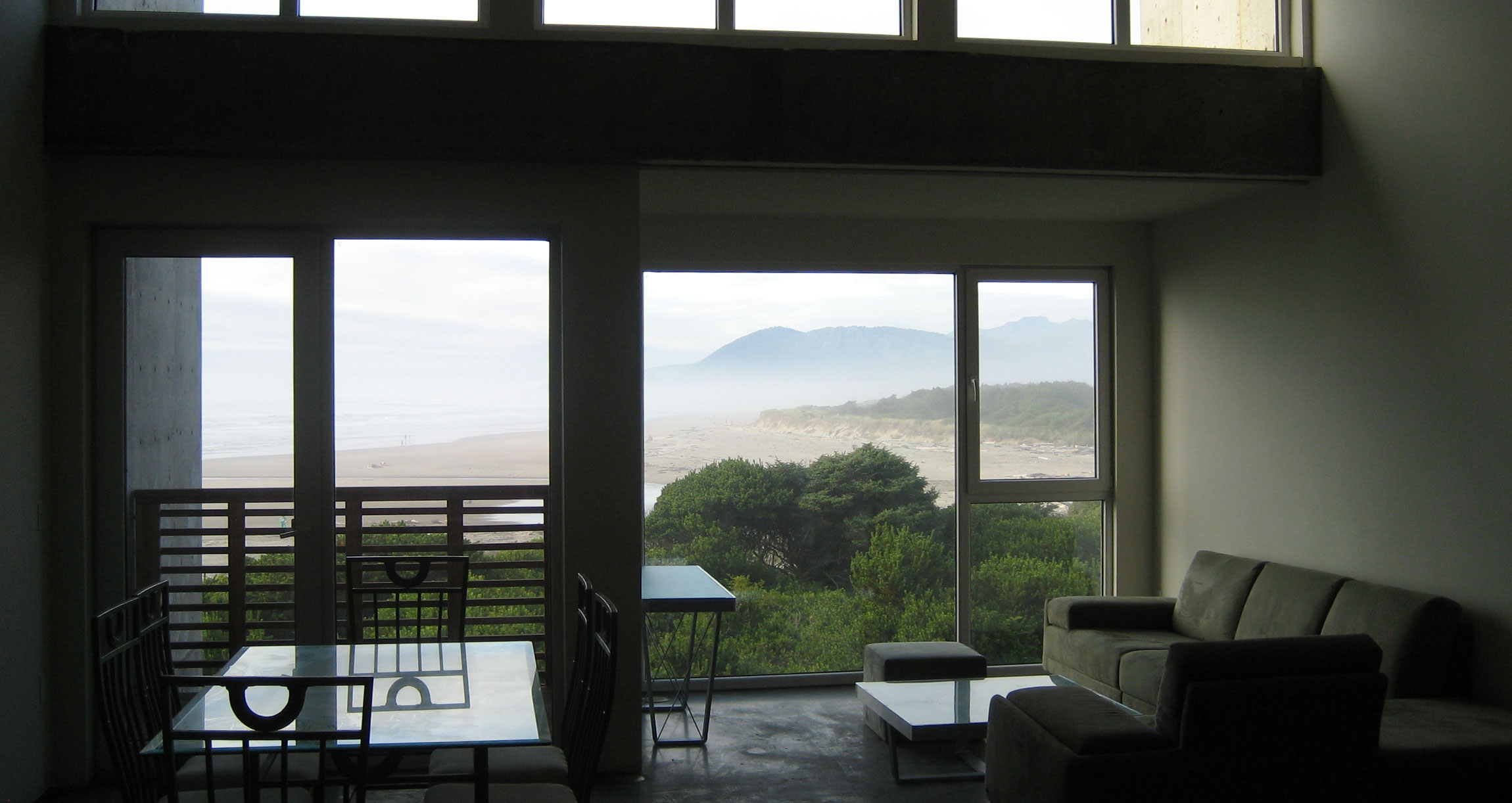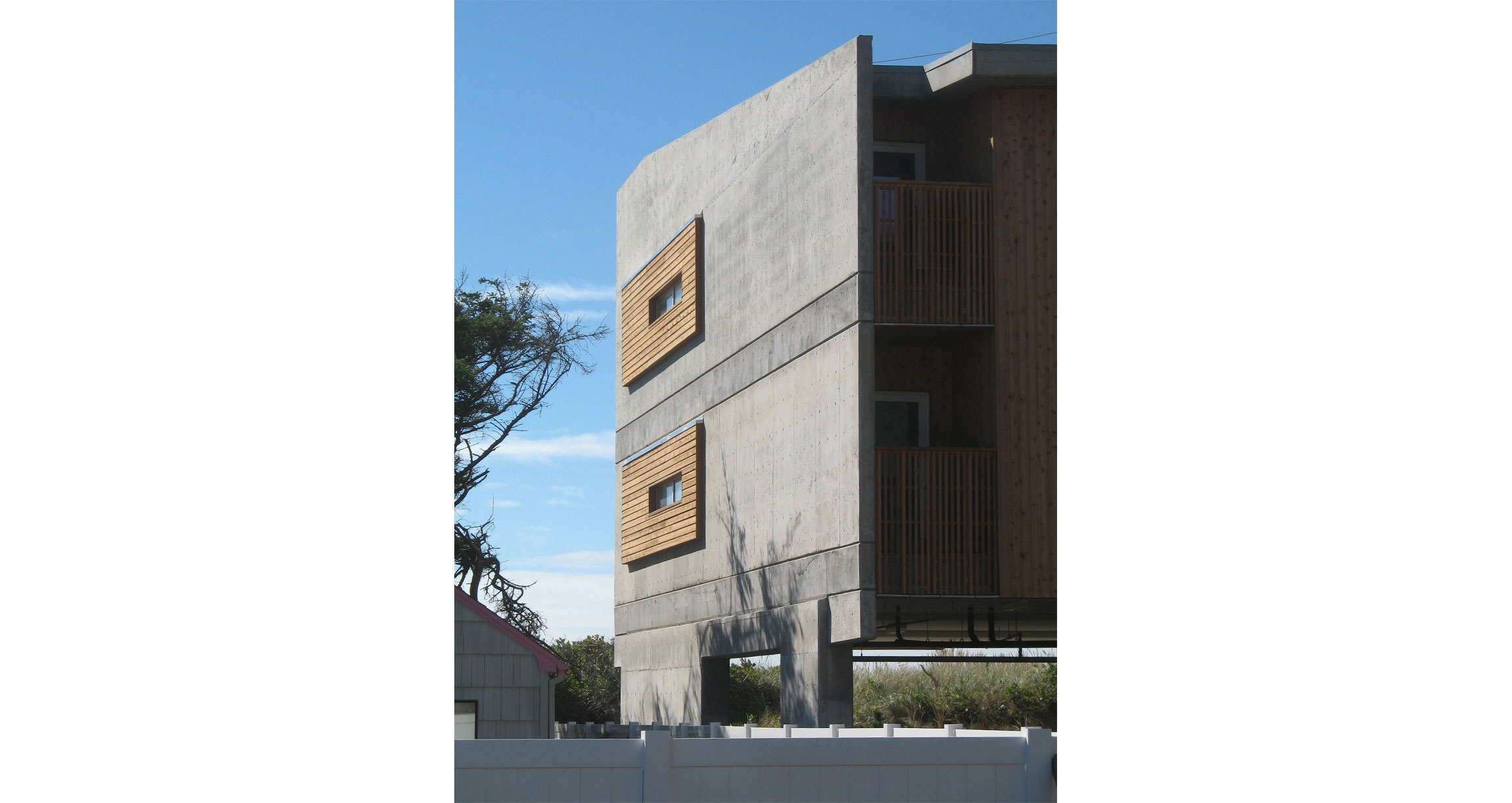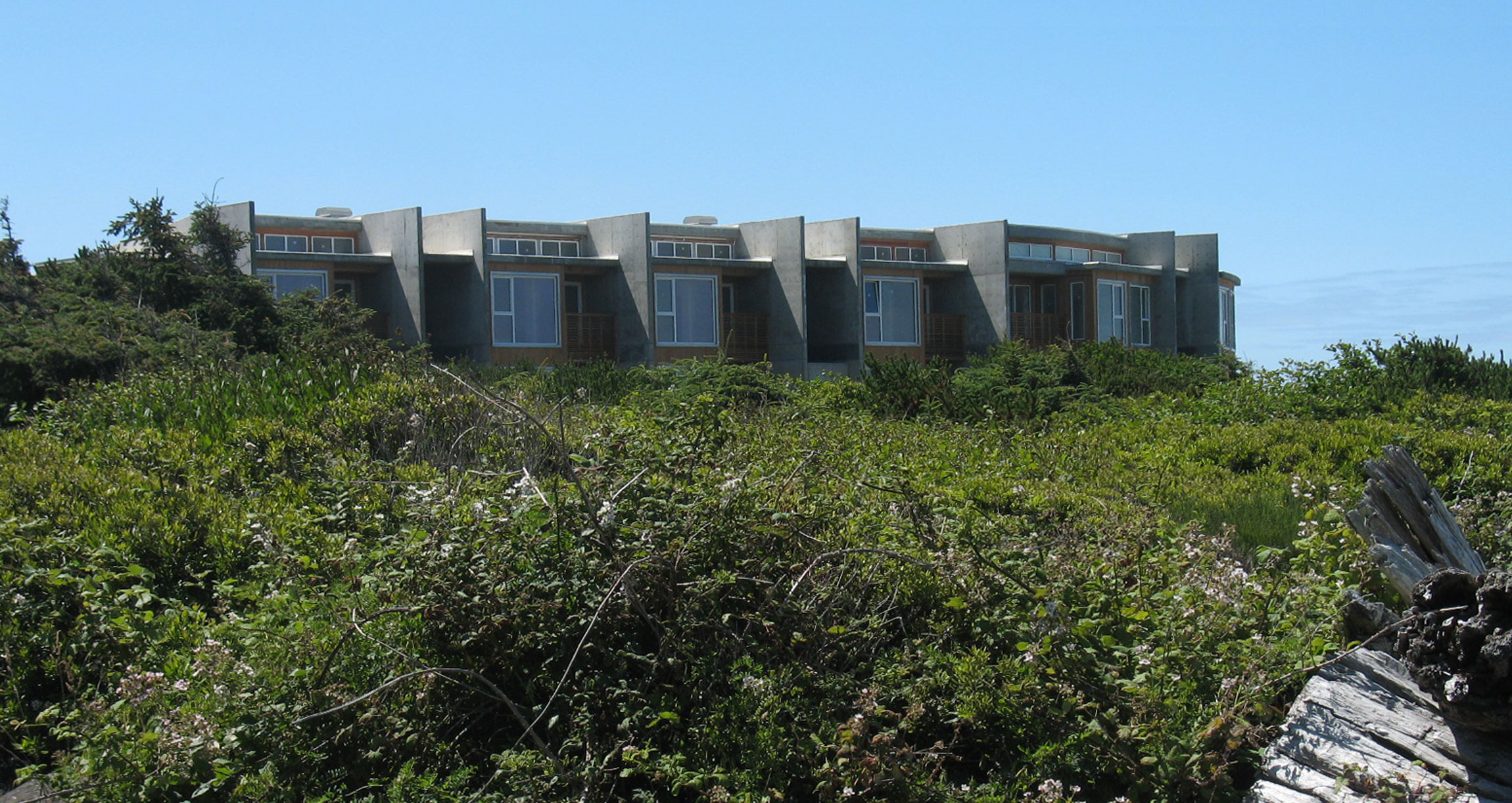Manhattan Beach Condominiums are located on an ocean front property in Rockaway Beach, Oregon. The project had to overcome floodplain and local height restrictions to meet the owner’s requirements for sixteen units with parking, constructed in a sustainable manner overlooking the ocean. A state park to the north allows for long term unfettered ocean views along the west and north edges of the site. Access is from the east along Highway 101, the coastal highway that runs the length of the State. Fan shaped to fit the site setback requirements and for better view capability, the building sits against the west and north edges of the property while a storm water bioswale and car access fill the rest of the site.