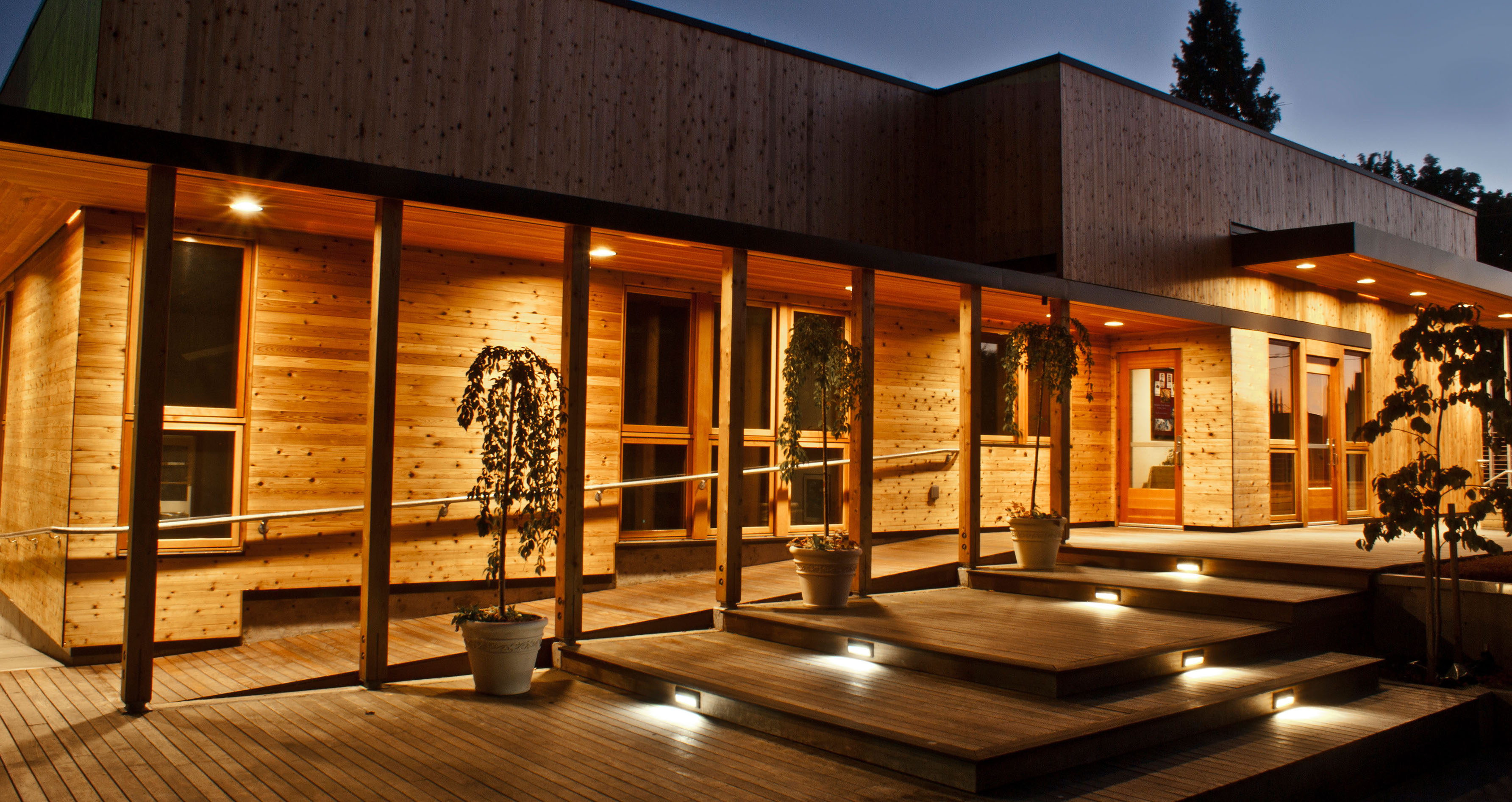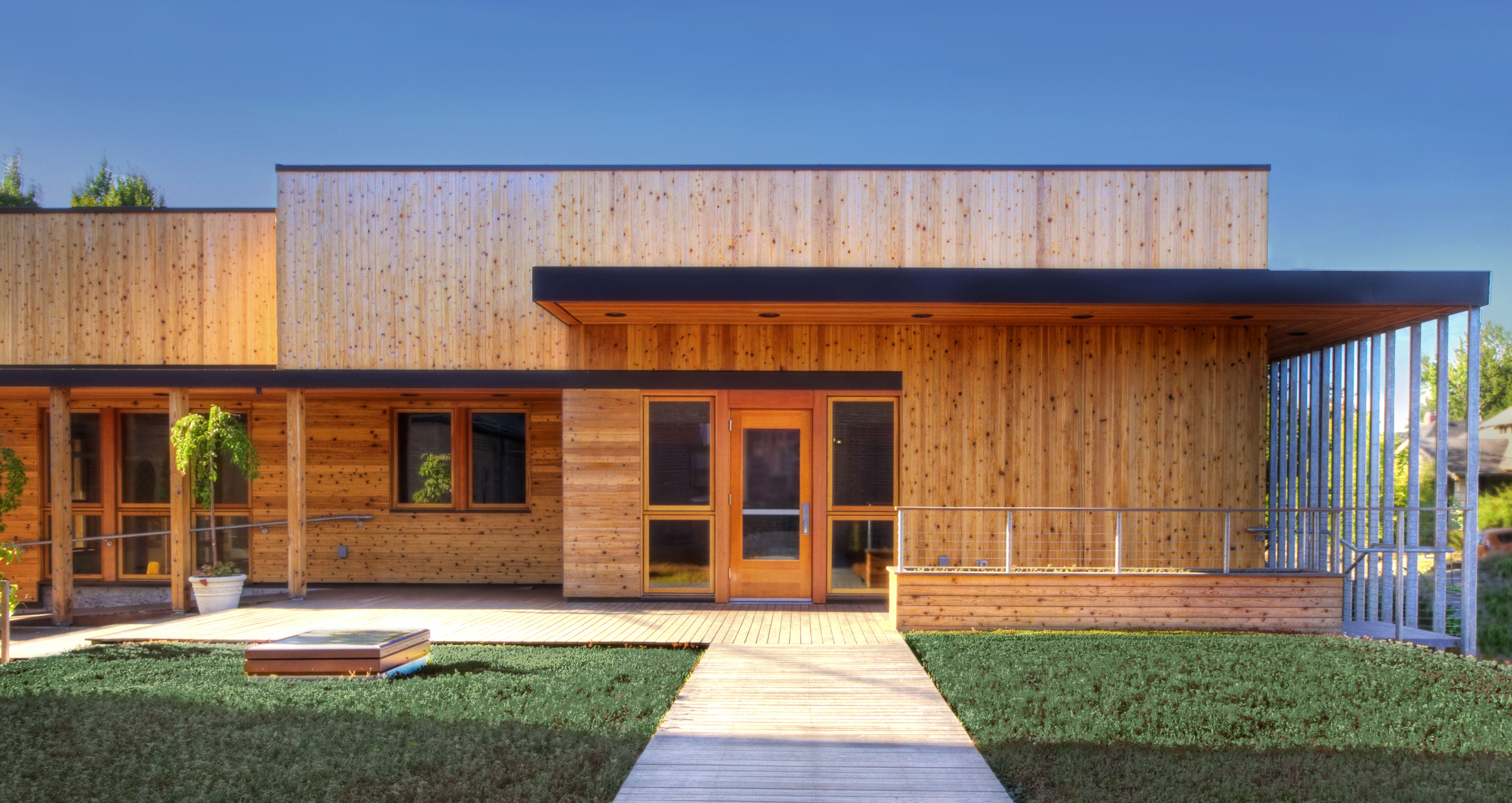 Currently, much of the site is asphalt between the existing structures. The design concept centers on replacing the asphalt with new paver courtyards. Outdoor plazas are proposed between the existing Church and School; and between the existing Offices and new Community Center expansion. They minimize asphalt, provide storm water control, create outdoor community gathering spaces and provide ADA access to the differing levels of the Church, Offices, and Community Center. The Community Center, in the middle of the site along NE 8th Avenue, will be enlarged with a two story addition north of the existing building with a ground floor that will stretch to the existing Parish Offices. The plaza above on the roof of this extension becomes one of the outdoor plazas covered with wood deck and an eco roof.