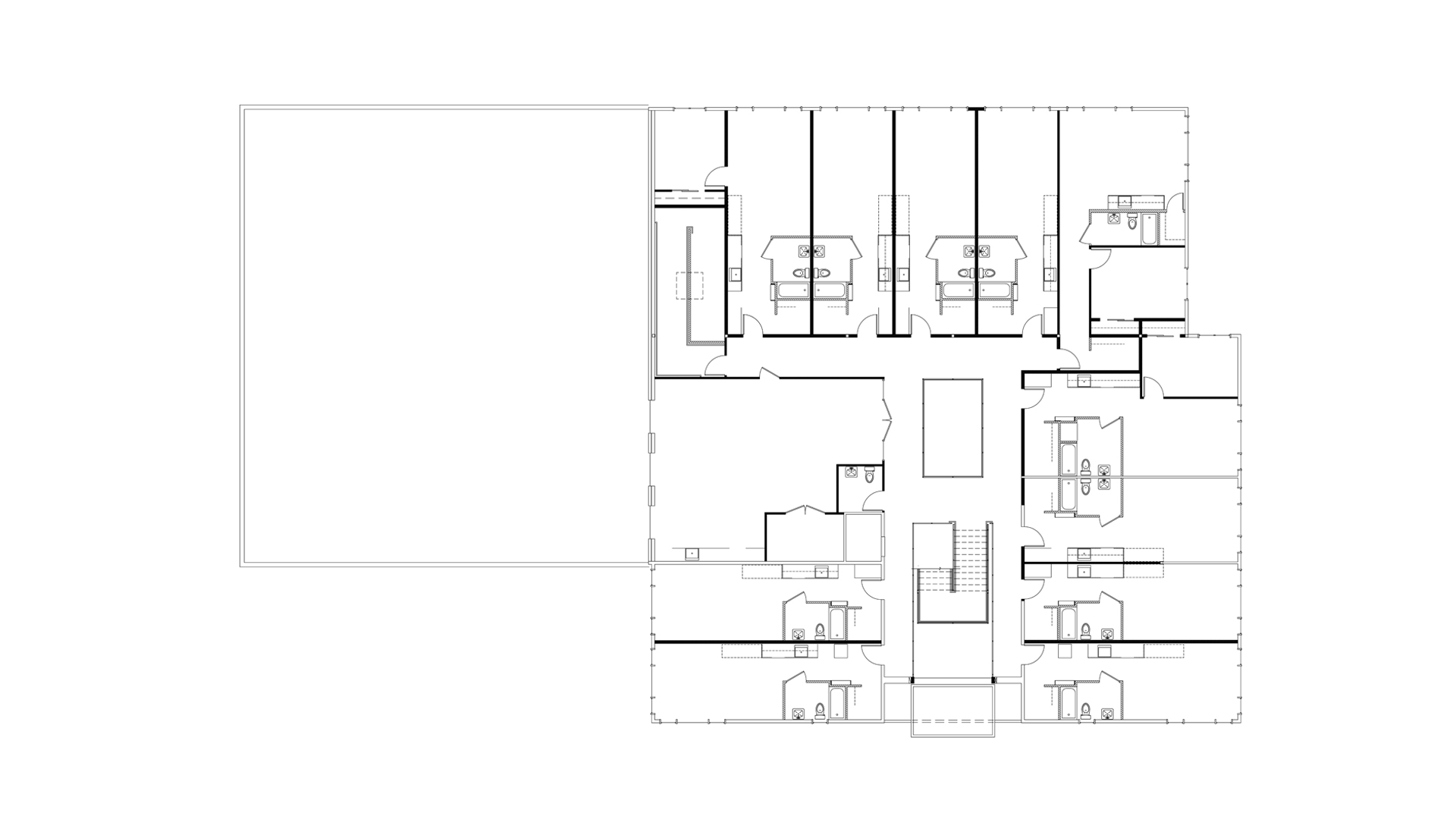 Designed to serve students of a nearby private college, the units are compact and efficiently laid out. The loft units have individual entry doors, a large operable window made of a glass garage door and an upper area sleeping loft that takes advantage of the high ceilings in the former print shop. The main building consists of 12 studios per floor, each floor the same. Inserted into the center of the building is a new grand staircase, lounge and gathering area to bring tenants together and reinforce community. Finally, a large room for tenant events and bike storage fill out the rest of the interior.