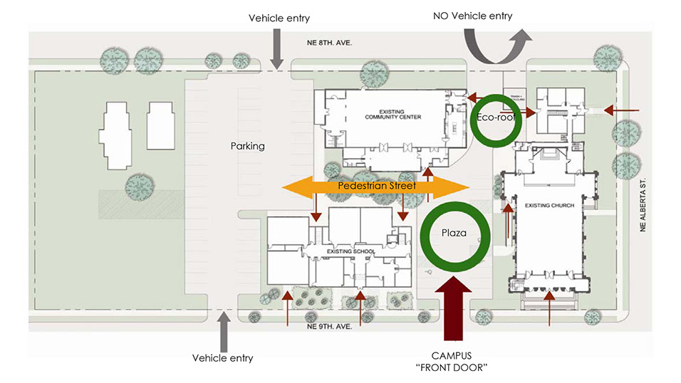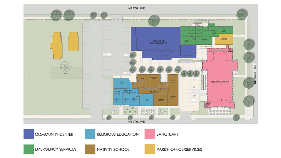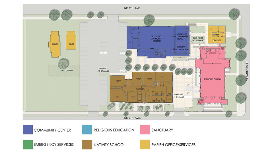 St. Andrew Church, located on Alberta Street in northeast Portland, Oregon, has played a vital role in its inner city neighborhood since its founding over one hundred years ago. During this century of ministry, St. Andrew has provided many services to the community and as the demographics and neighborhood have changed so has their space needs. Likewise, the St. Andrew Nativity School, operating in the Parish’s school building since 2001, needs additional room for its growing program, increasing the pressure on an already short supply of space. These requirements afforded an opportunity, not only to address the limited space but to also reorganize the site to be more efficient and inviting.