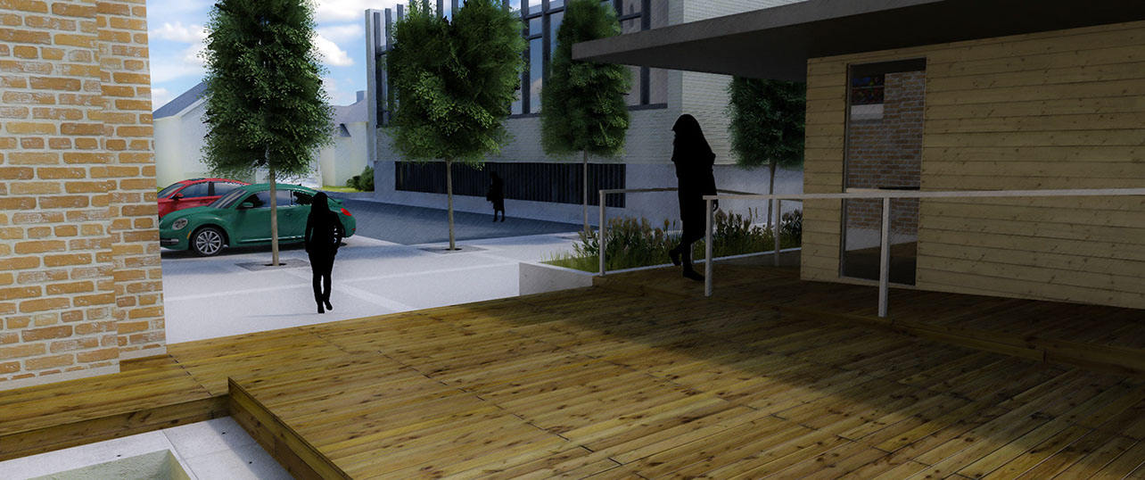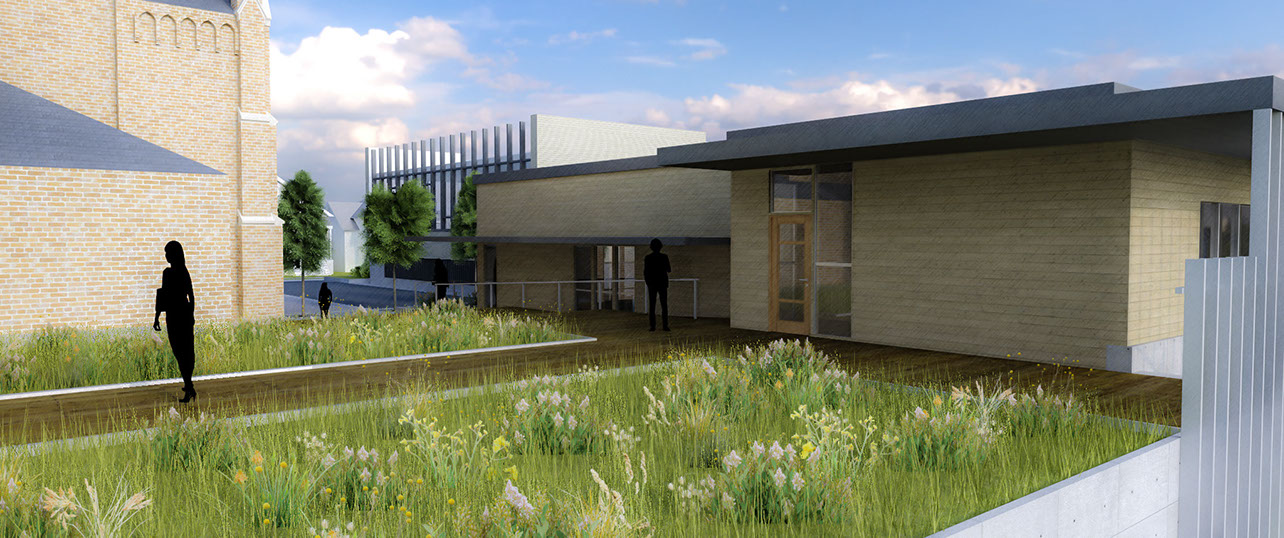 An outdoor pedestrian “street” between the Community Center and the School will lead from this “piazza” to the principal parking lot connecting the Church and the surrounding buildings. Additions are proposed to the north of both the Community Center building and existing School to provide needed space for meetings and classrooms. Spanning between the existing offices and community center is planned a partially below grade center for social services covered with a green roof and deck that connects the church, office building and community center. Combined, these improvements connect the various building levels alleviating most of the accessibility issues, further connecting the campus into a unified whole.