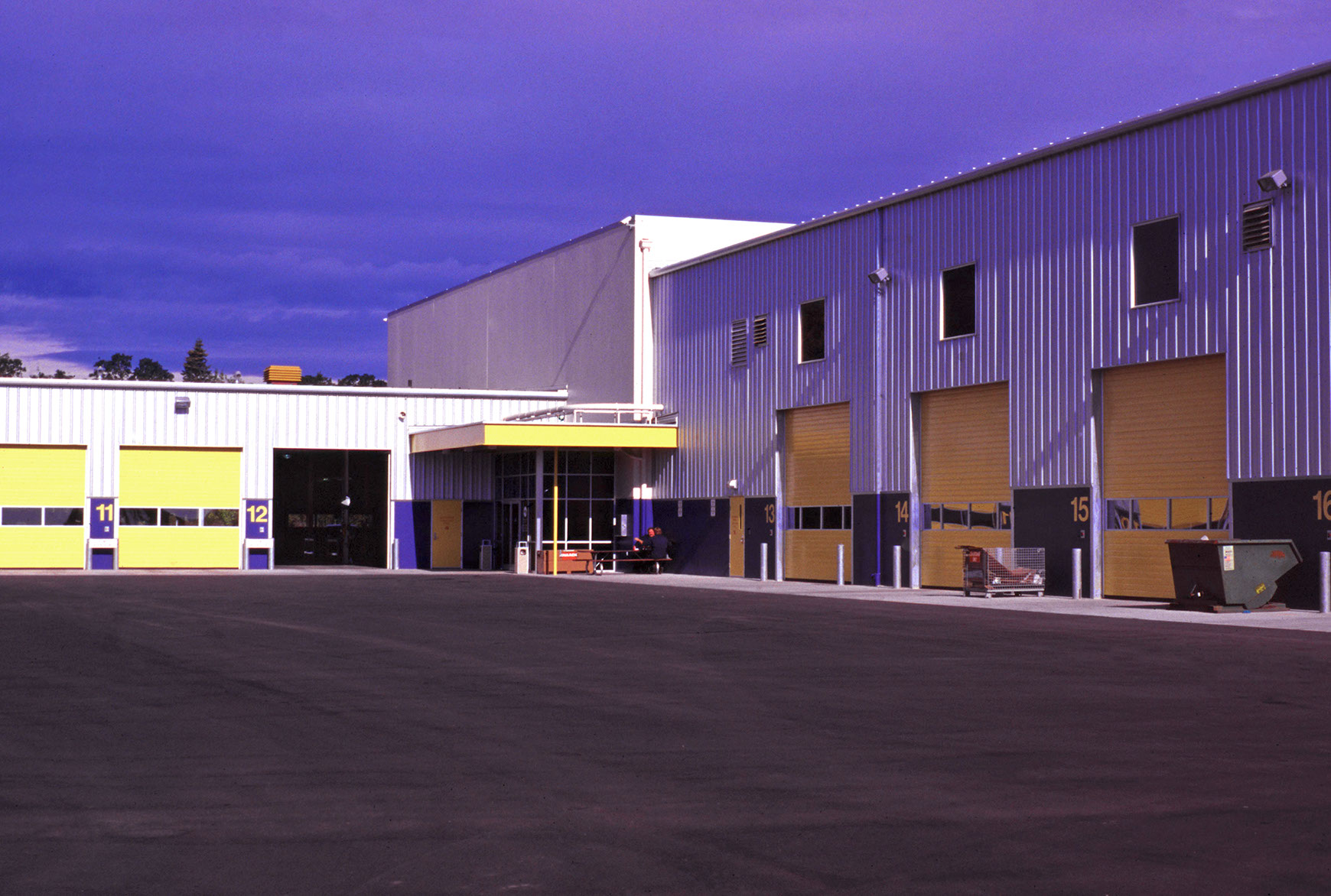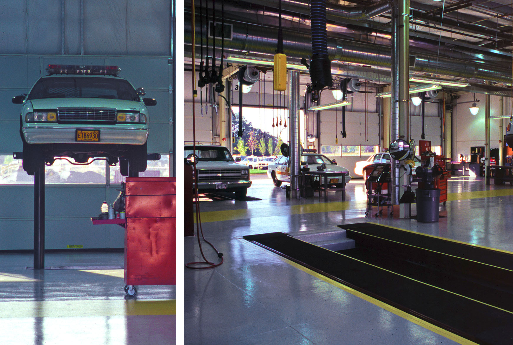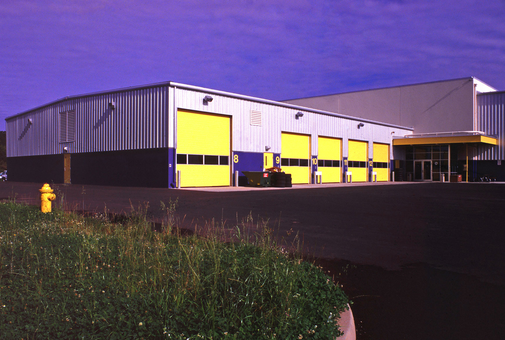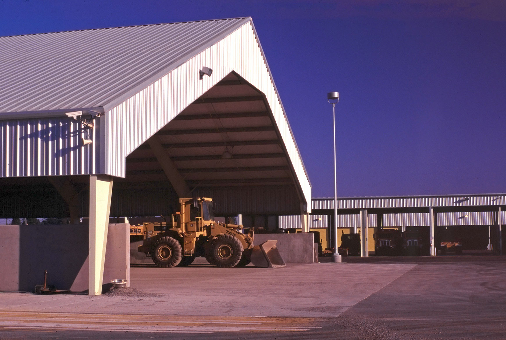 The county used a design-build process to insure the facility met the extremely tight budget and time constraints. Tilt-up concrete forms the two story office/warehouse component while the rest of the structures are steel framed, wrapped in zinc and highlighted with the county's colors of dark blue and yellow.