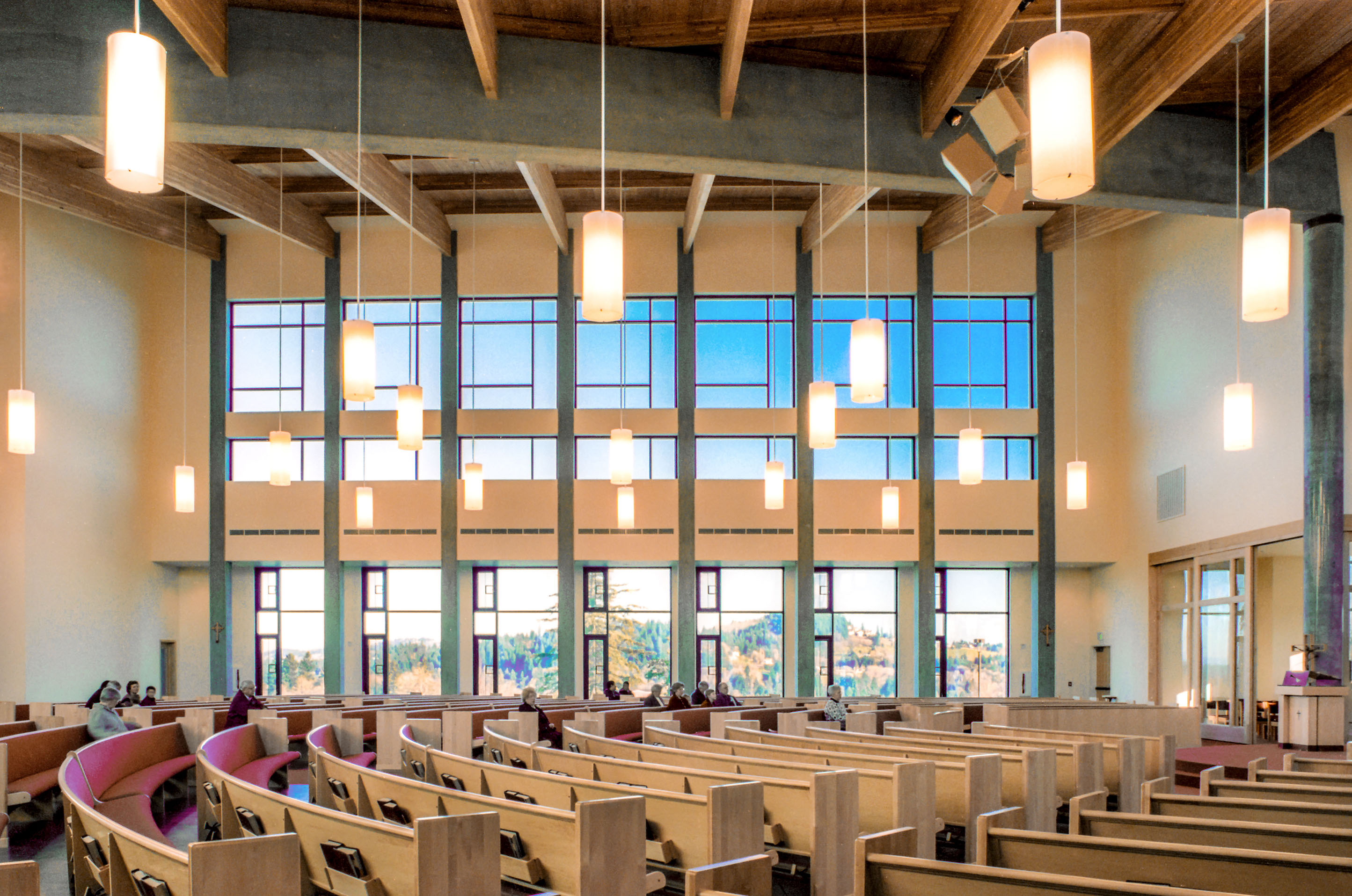 The exterior shape of the building is a direct response to forces of the site. To open the building up to the northern view beyond, the roof slopes up from the south to reach an interior height of 45 feet above the floor. A pop-up clerestory, pitched to the south, brings in sunlight and gives interior views up the hill to the evergreens outside. Finally, to insure that the space is high over the altar, the roof slopes up from the entry to a skylight high above the sanctuary space below. From the interior the dynamic roof appears to take flight in three directions; but from the outside the appearance of a simple single pitched roof is dominant. Finally, the building is wrapped in masonry, cedar board and batten, and stucco. These materials are used on the exterior to link the building to a northwest tradition of architecture. Ultimately, it’s that connection to the Pacific Northwest that gives this structure a sense of timeless design.