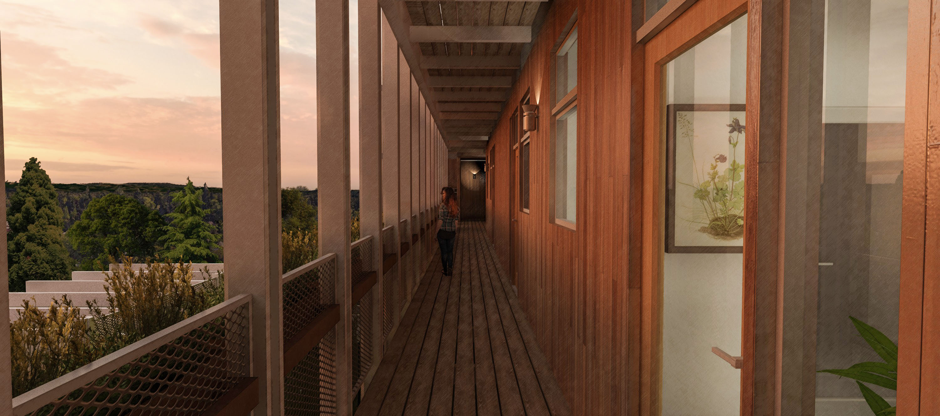 So we brainstormed top lit slits that occur in our world; we thought of the streets of Europe and the alleys of New York City. But as north-westerners we found our inspiration in gorges. And as Portlanders, we thought of Oneonta. We mirror the existing window screen to create a canyon. We use the same reflective materials and grating to mimic the light play that happens through the trees in a gorge. We imagine window boxes to drape greenery directly referencing the nature. And at the ending L of our gorge we design a hike’s reward in the form of a water feature. Our waterfall takes a third of the roof water during rainy days and runs it down a wall screen to a pool that eventually funnels to the storm water system.