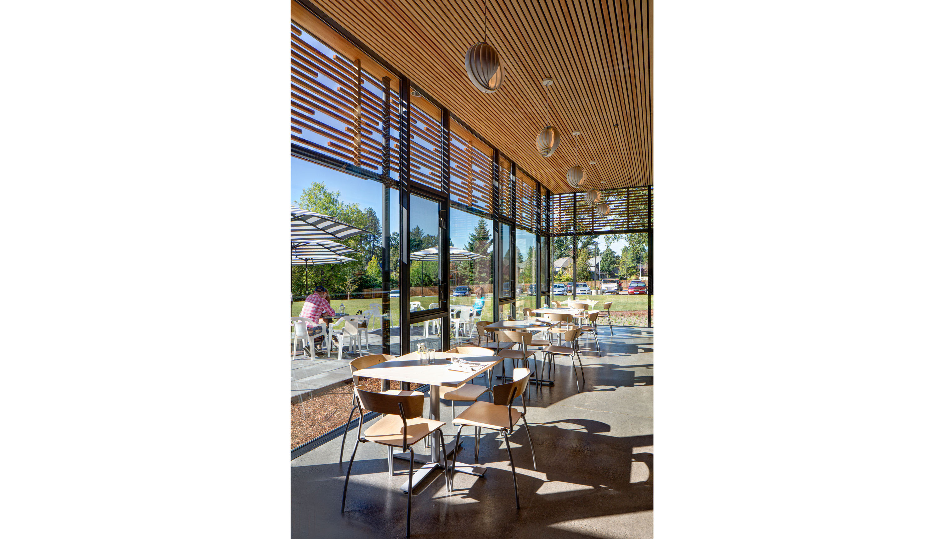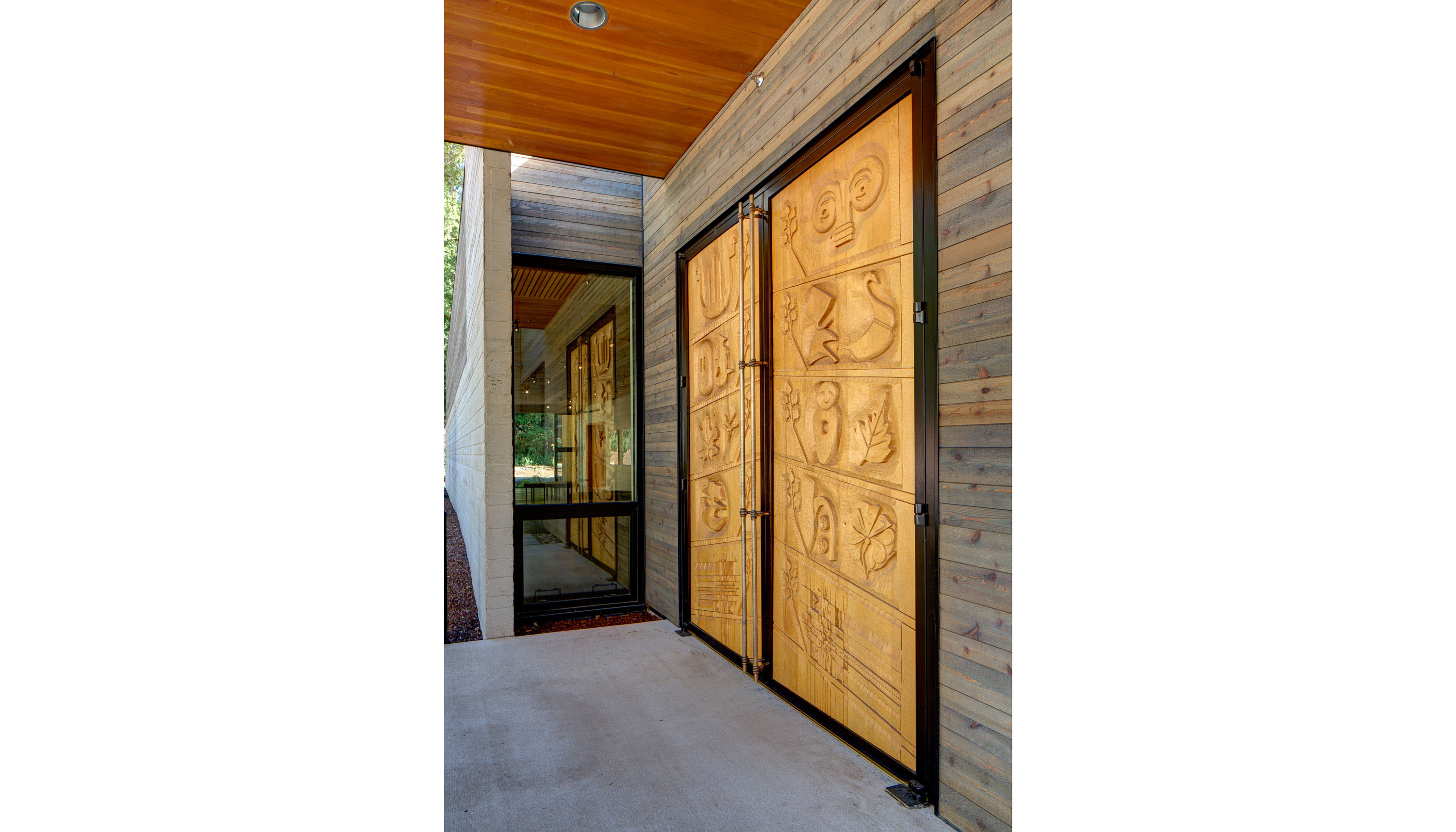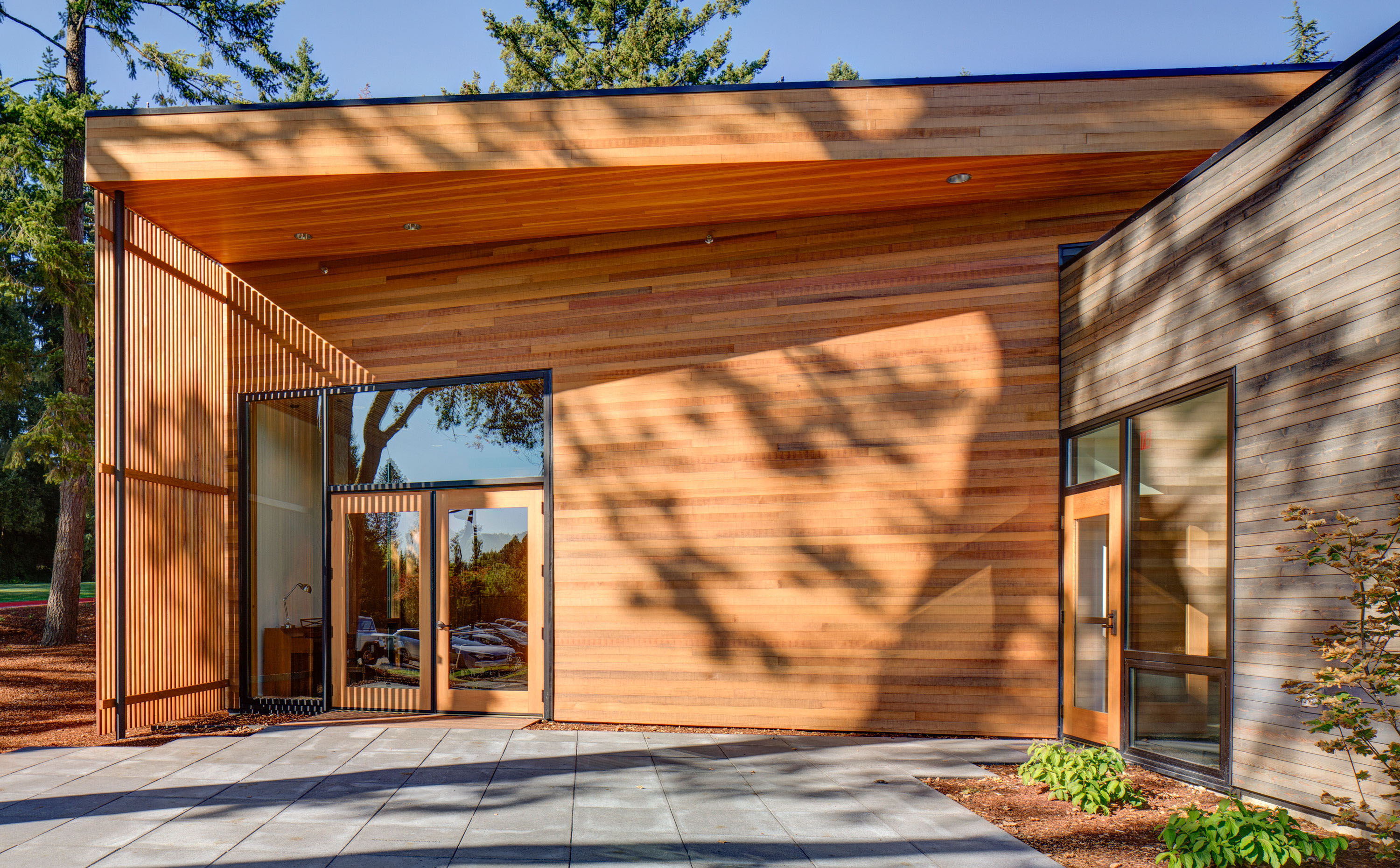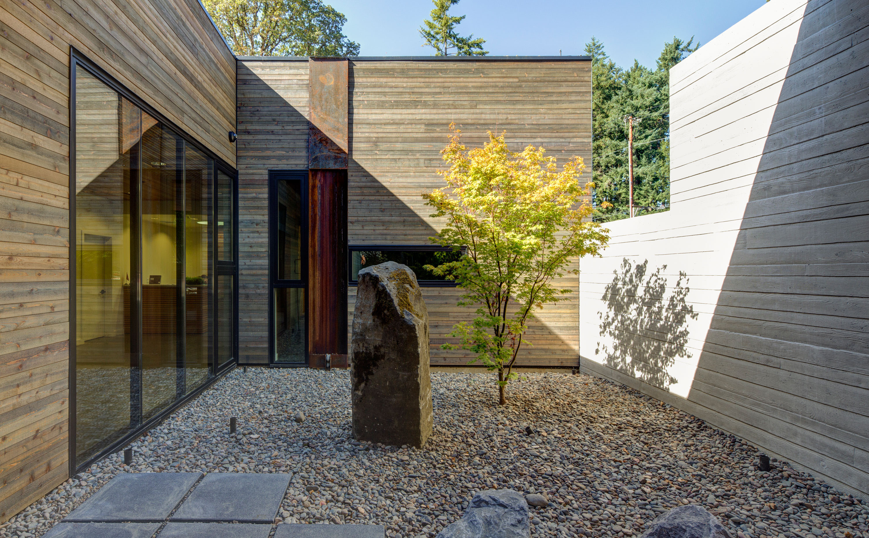 We took these basic notions of Scandinavian design and applied them to our Oregon context. The building is sited in the customary street-wall to garden-wall configuration. Entry is through two hand carved doors by the late great Leroy Setziol—an opening in a layered wall system that step by step leads one away from the street. Once inside the layers give way to glass enclosure revealing the green of the enveloping woods; the effect is one of nestled sanctuary. Light is harvested and rationed through the large glass walls topped with exterior shading-screens to dapple the light, mimicking the forestation beyond. The building is finished with Oregon wood throughout and topped with a sedum green roof in keeping with the Nordic and Northwest traditions of sustainability.
