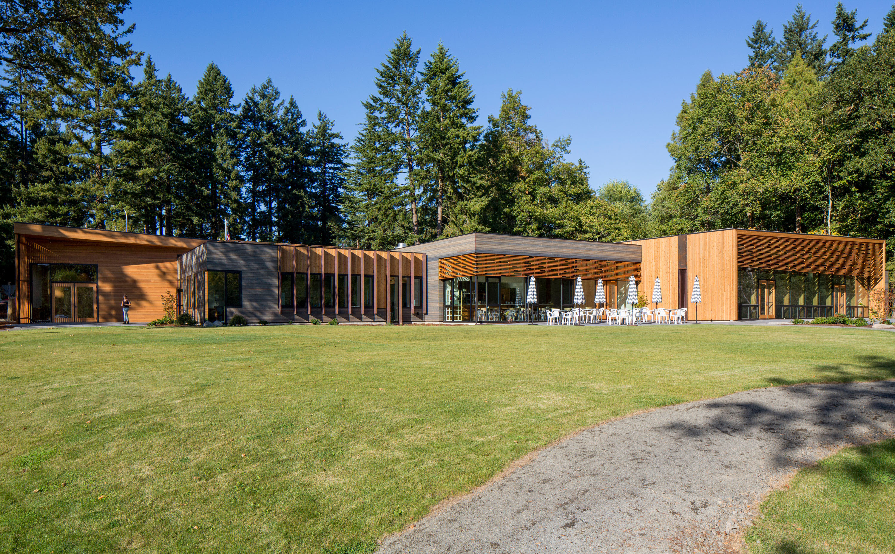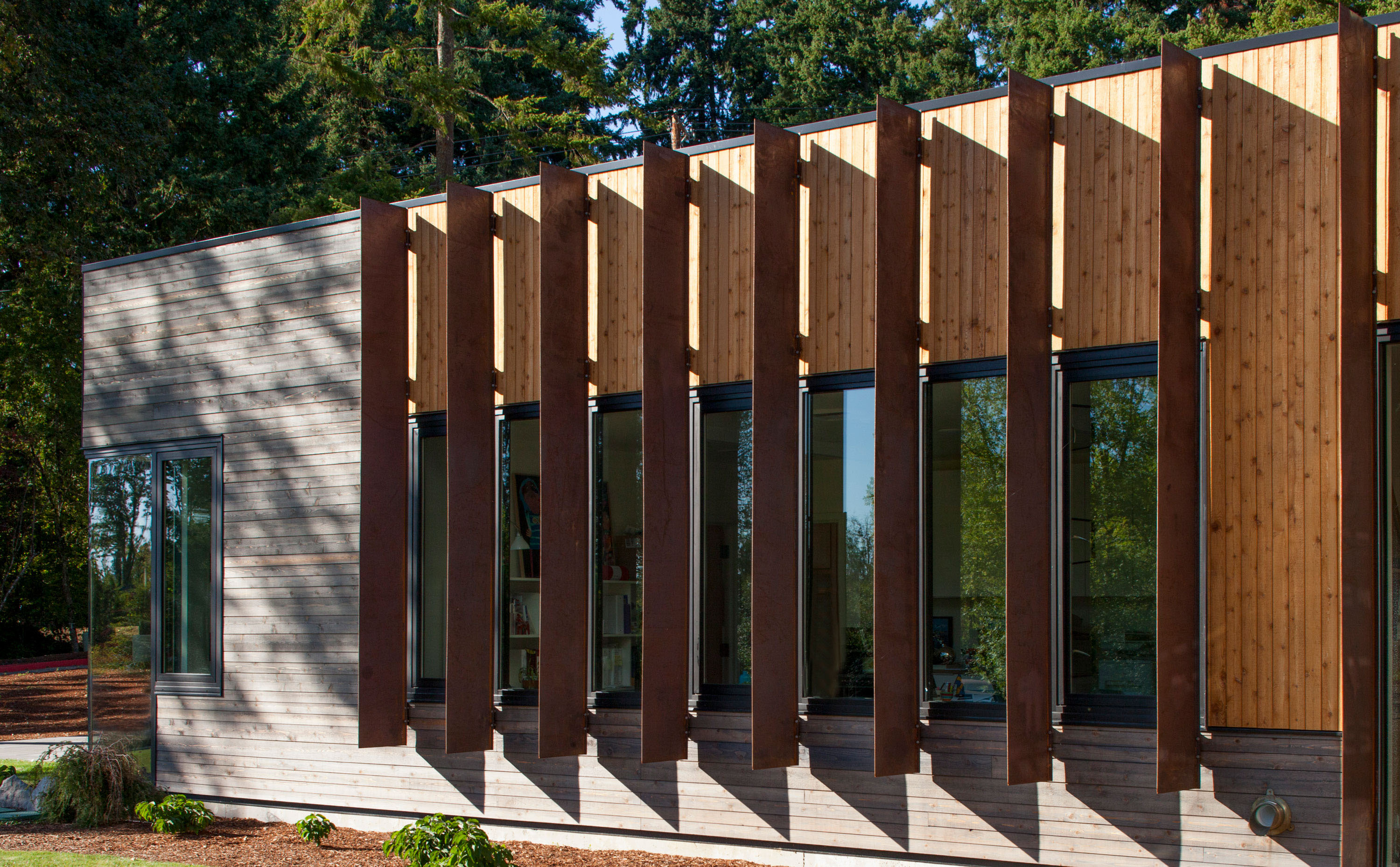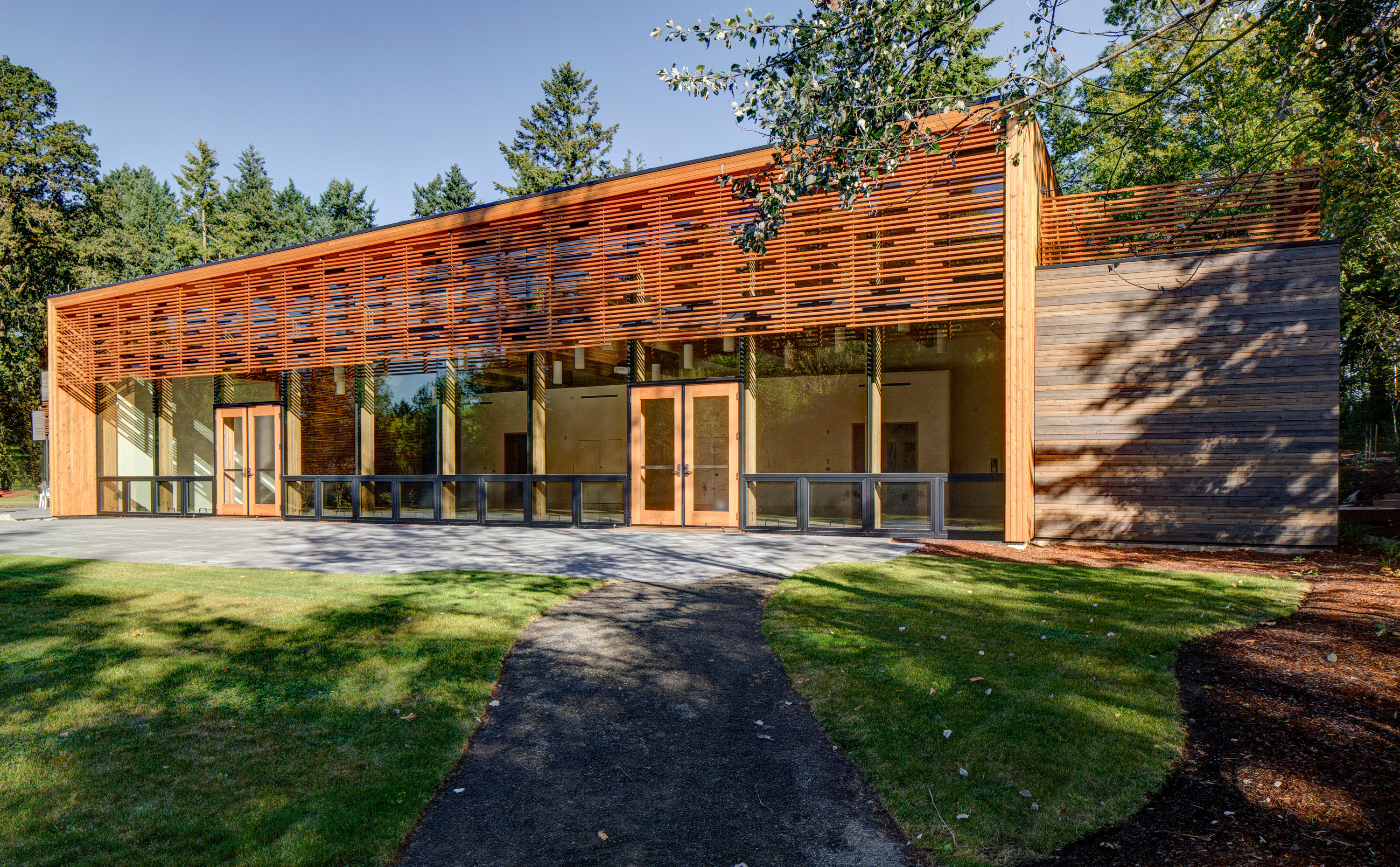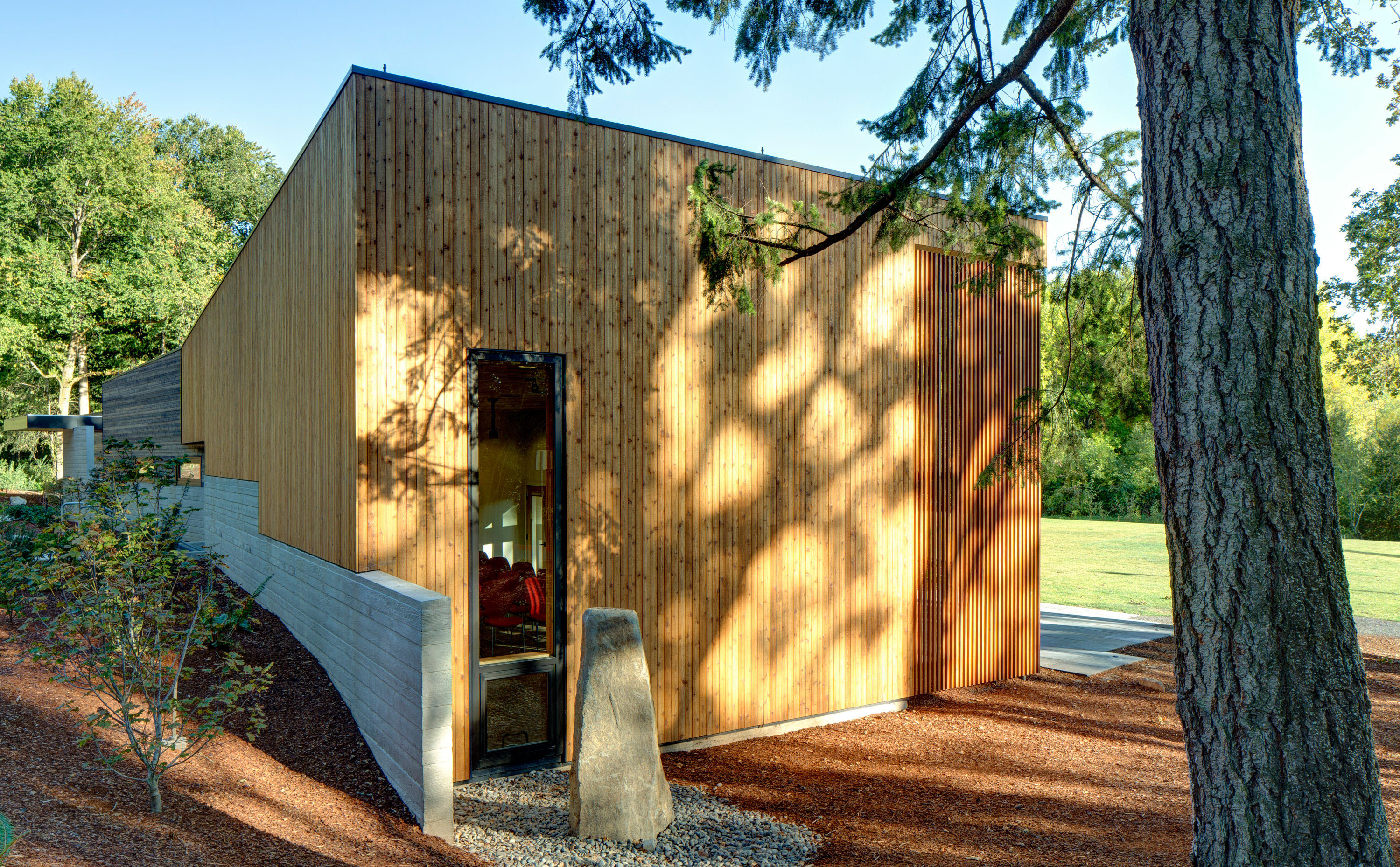 We took these basic notions of Scandinavian design and applied them to our Oregon context. The building is sited in the customary street-wall to garden-wall configuration. Entry is through two hand carved doors by the late great Leroy Setziol—an opening in a layered wall system that step by step leads one away from the street. Once inside the layers give way to glass enclosure revealing the green of the enveloping woods; the effect is one of nestled sanctuary. Light is harvested and rationed through the large glass walls topped with exterior shading-screens to dapple the light, mimicking the forestation beyond. The building is finished with Oregon wood throughout and topped with a sedum green roof in keeping with the Nordic and Northwest traditions of sustainability.