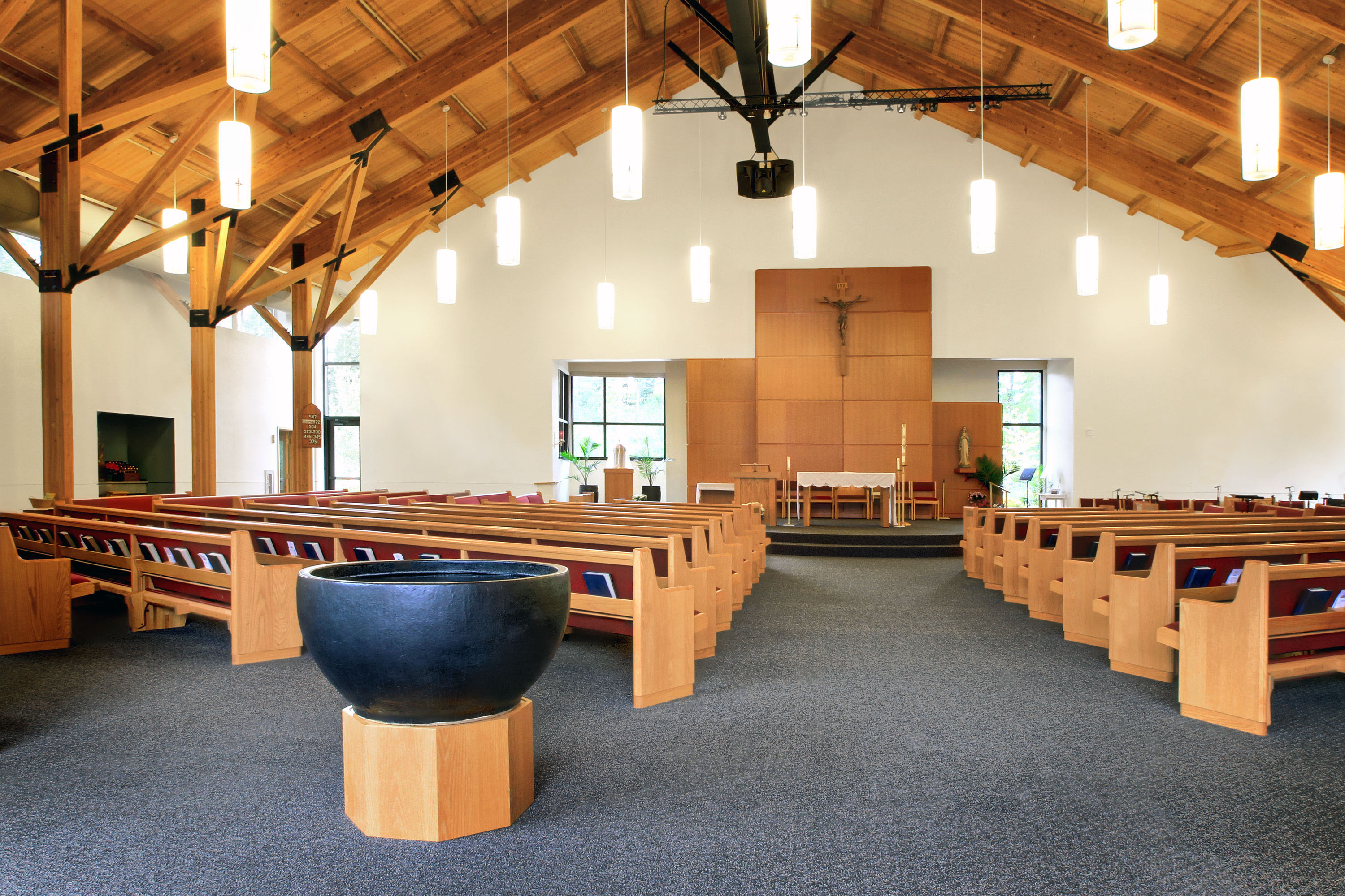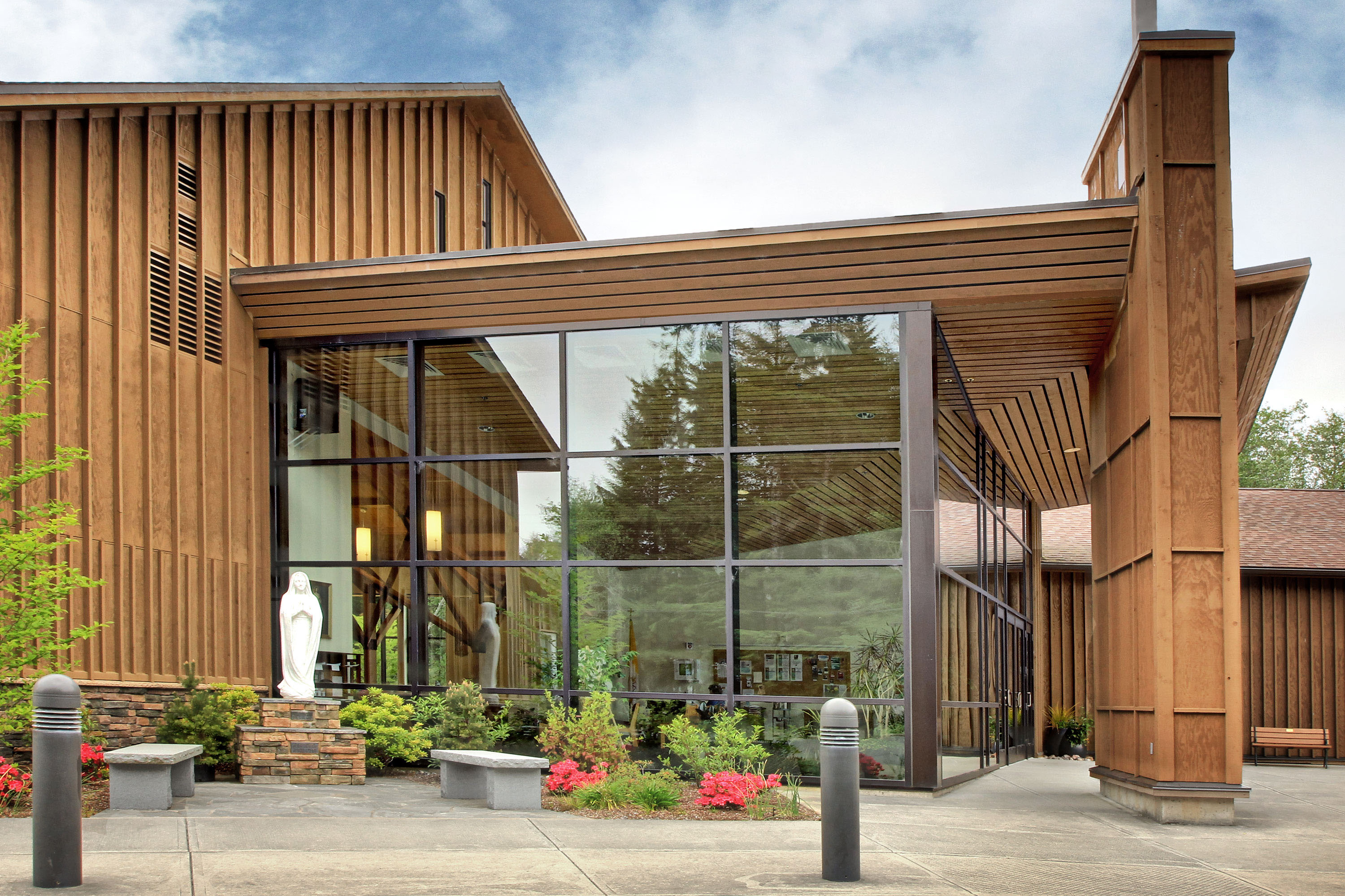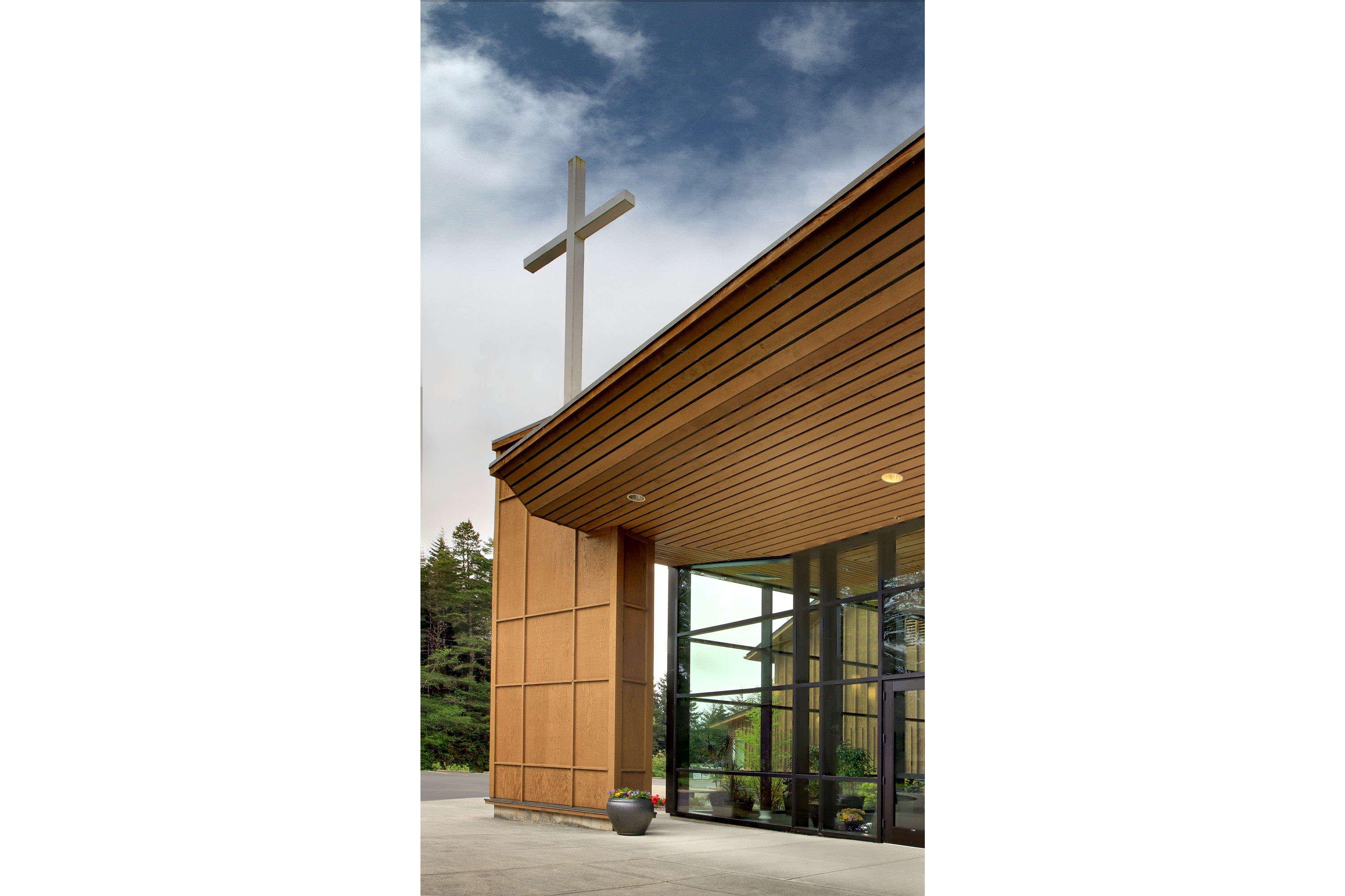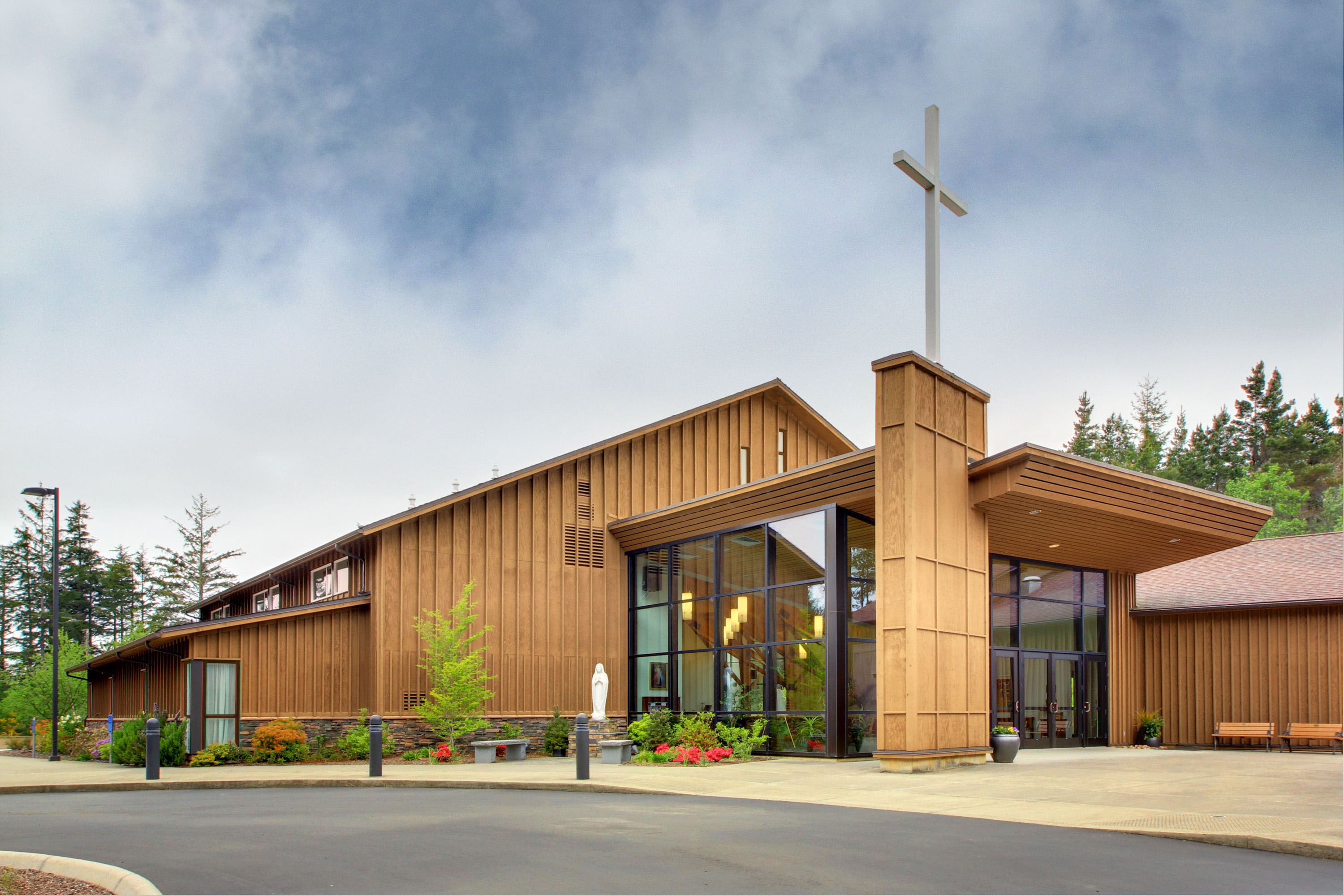 This 400 seat church is the first phase of a campus master plan commissioned by St. Mary Our Lady of the Dunes, a parish in Southern Oregon. As dictated by the master plan, the existing church will become the hall and the existing hall will become new classrooms when the project is complete. Pews, arranged in a half circle around the raised sanctuary, allow the worshipers to see each other and be closer to the altar. Housed under a structure of wood trusses, columns and ceiling, the space is designed to highlight the gathering. Natural light is allowed to penetrate through a series of clerestory windows which also provide natural ventilation. Board and batten siding, simple pitched roof, and brown color tie the new building to the existing Parish architecture.
