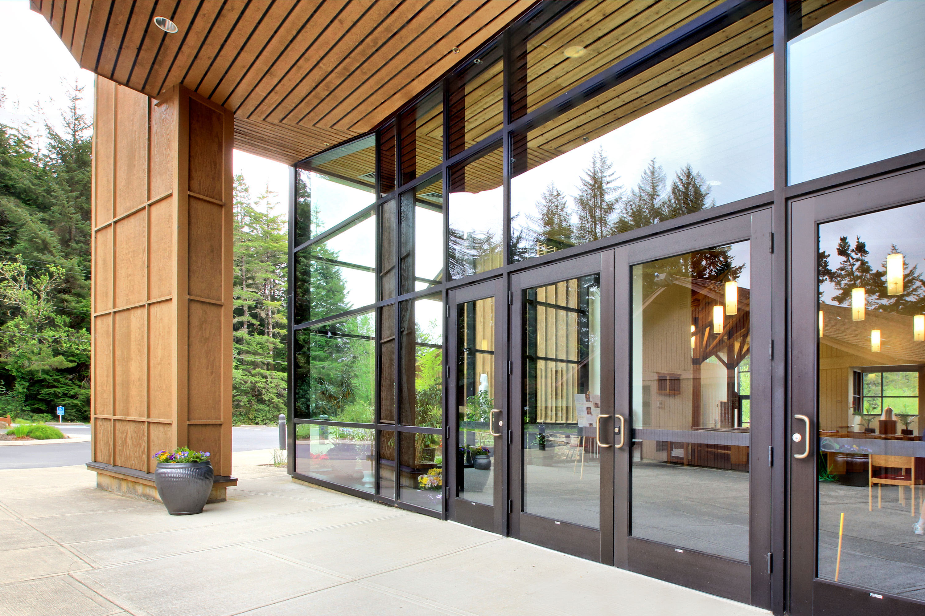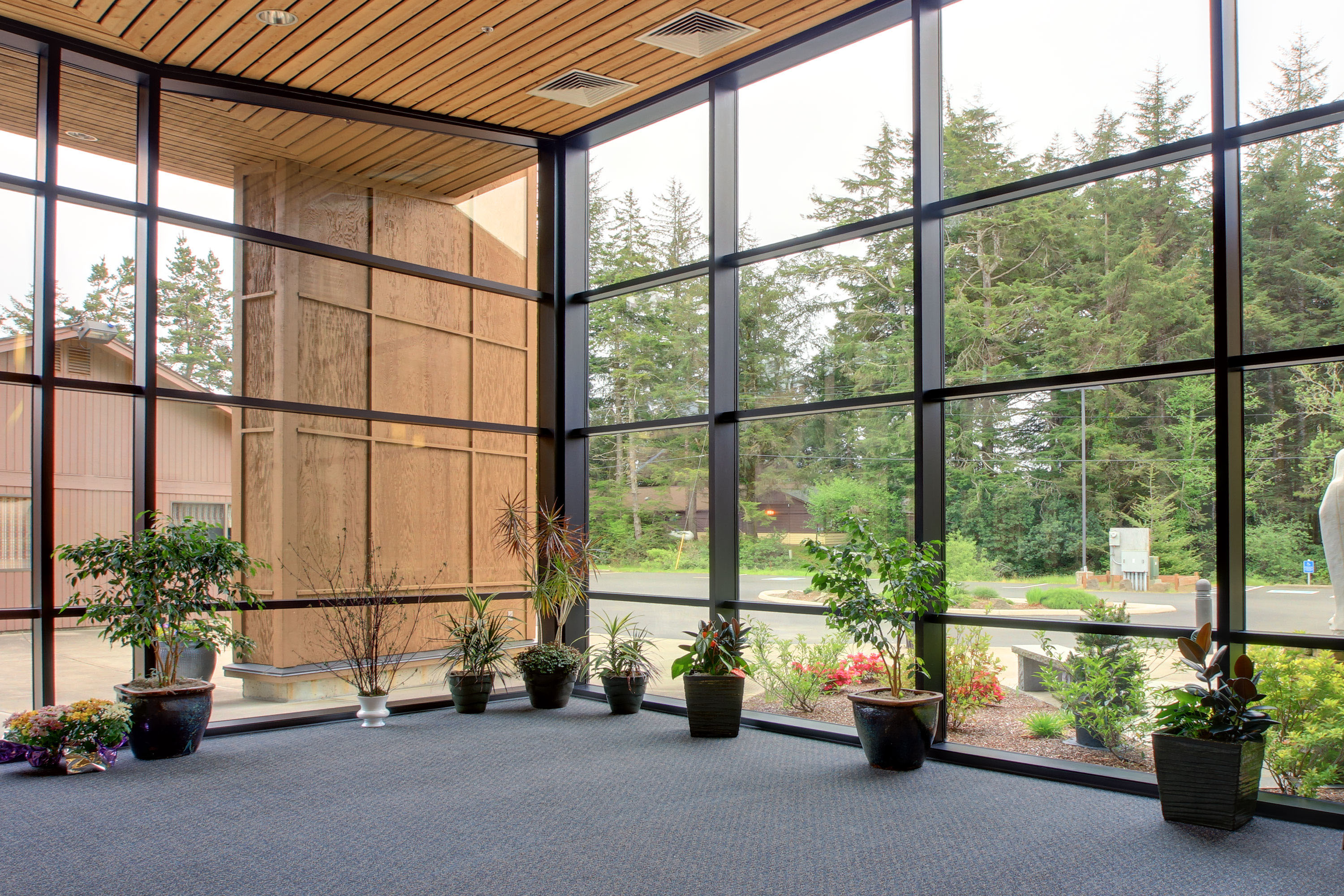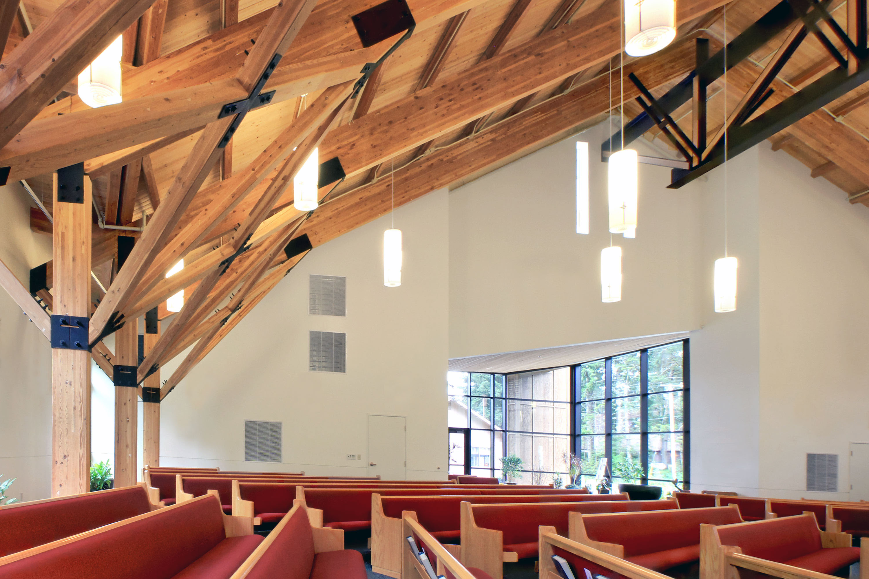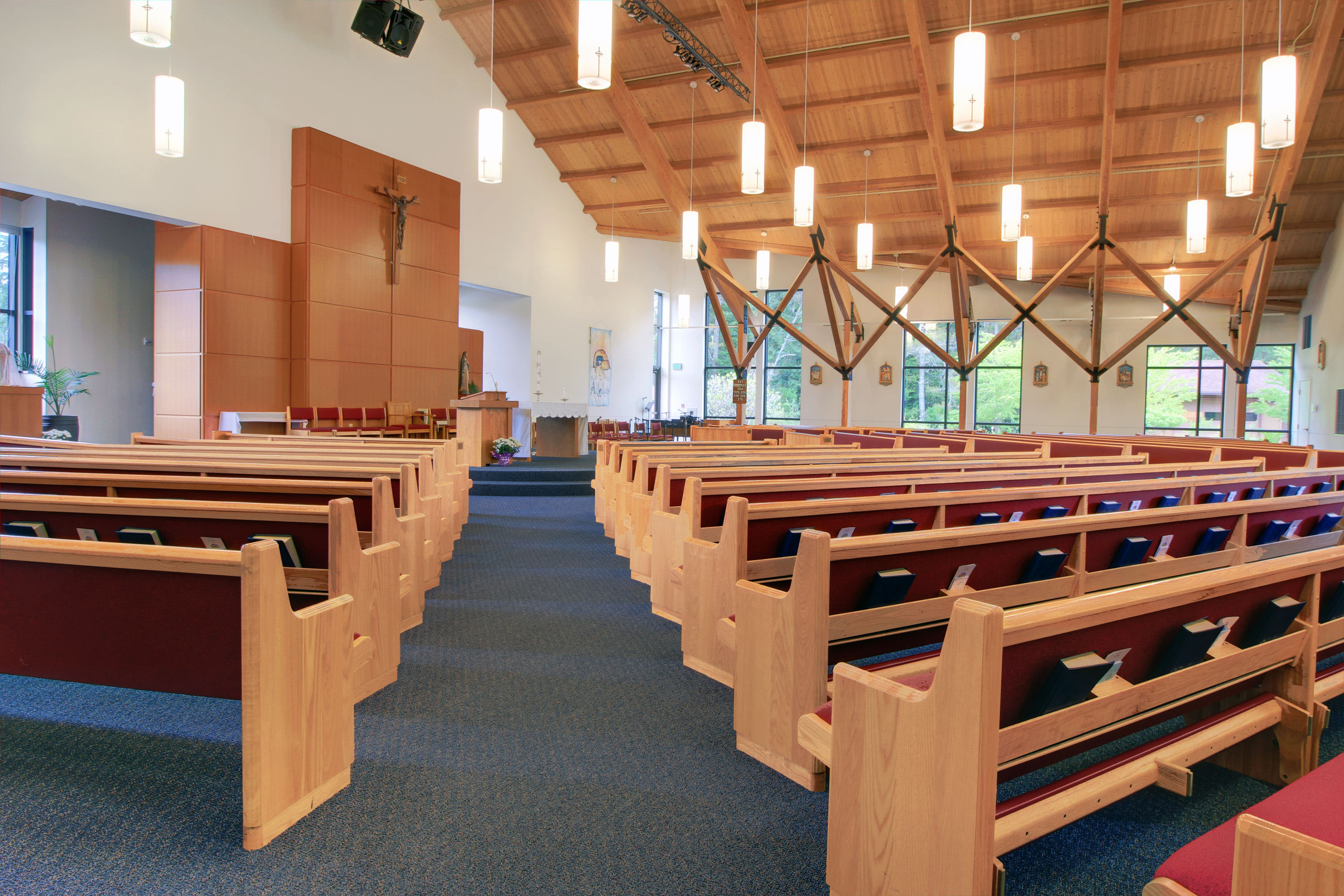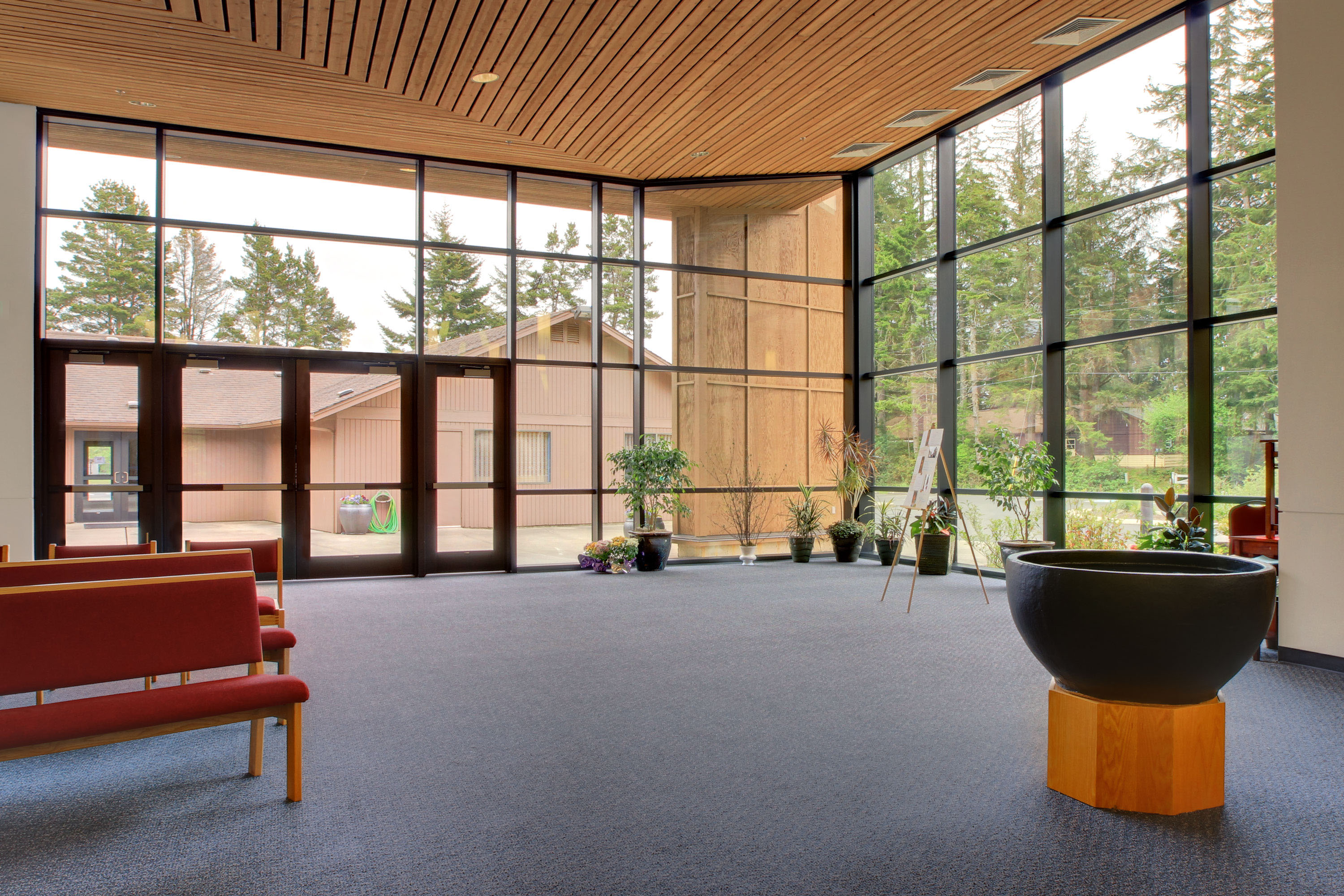 This 400 seat church is the first phase of a campus master plan commissioned by St. Mary Our Lady of the Dunes, a parish in Southern Oregon. As dictated by the master plan, the existing church will become the hall and the existing hall will become new classrooms when the project is complete. Pews, arranged in a half circle around the raised sanctuary, allow the worshipers to see each other and be closer to the altar. Housed under a structure of wood trusses, columns and ceiling, the space is designed to highlight the gathering. Natural light is allowed to penetrate through a series of clerestory windows which also provide natural ventilation. Board and batten siding, simple pitched roof, and brown color tie the new building to the existing Parish architecture.