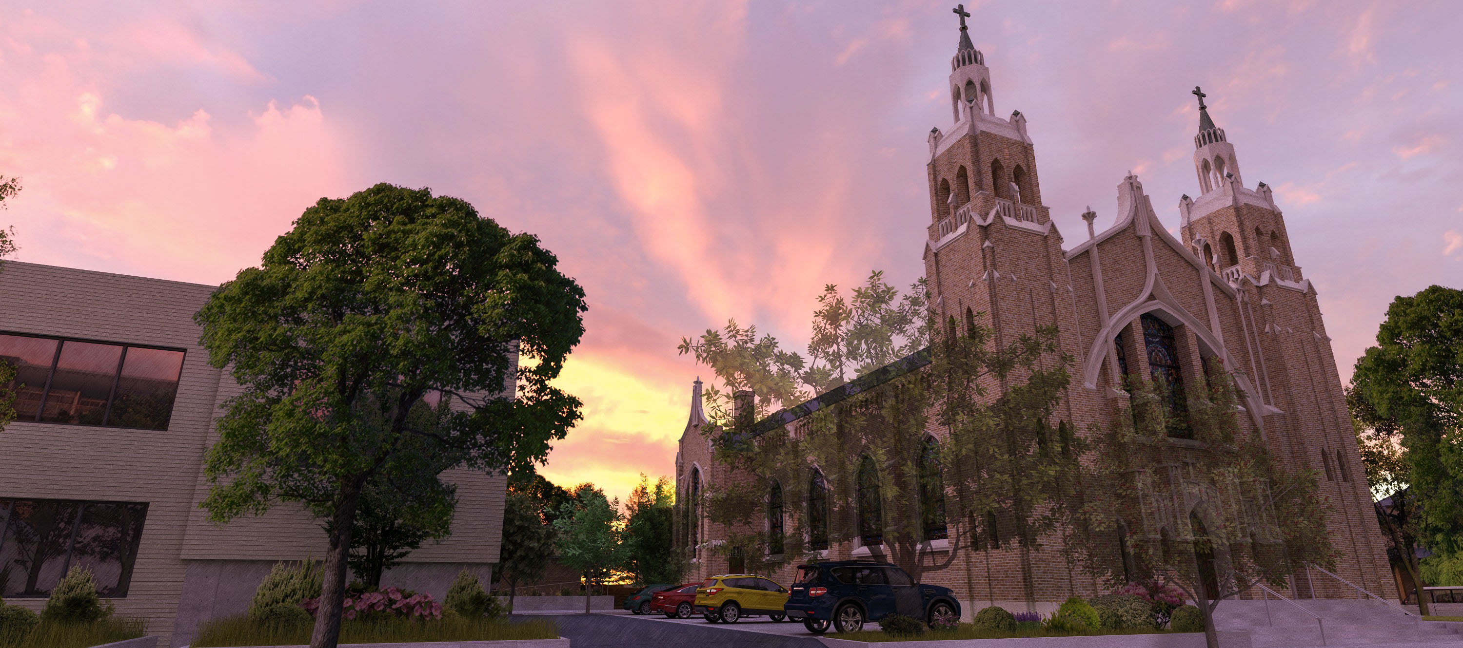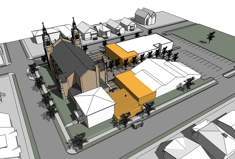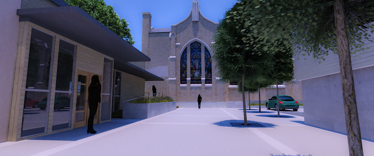 An outdoor pedestrian “street” between the Community Center and the School will lead from this “piazza” to the principal parking lot connecting the Church and the surrounding buildings. Additions are proposed to the north of both the Community Center building and existing School to provide needed space for meetings and classrooms. Spanning between the existing offices and community center is planned a partially below grade center for social services covered with a green roof and deck that connects the church, office building and community center. Combined, these improvements connect the various building levels alleviating most of the accessibility issues, further connecting the campus into a unified whole.
