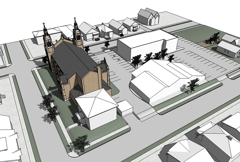 The campus of St. Andrew has no real “Front Door” to the neighborhood. To further compound this, the buildings are completely surrounded by asphalt paving allowing vehicle and pedestrian traffic to intermingle. This master plan proposes a new campus “entrance” off of 9th street between the existing church and school. This space, repaved with pervious pavers, will allow parking for the disabled and seniors near the church but have the feel of an Italian piazza. To further reinforce this concept, the master plan closes the existing drive aisle off of 8th street reclaiming the space for needed multipurpose facilities.