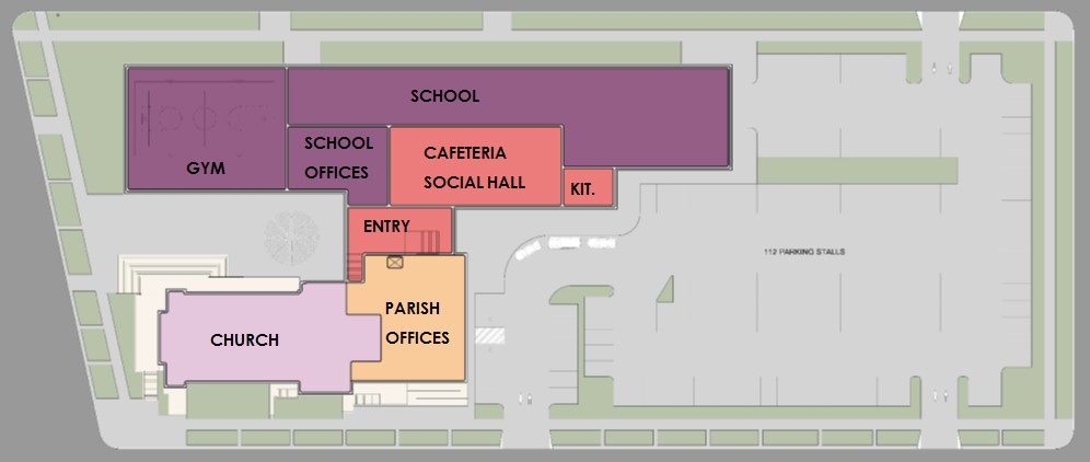 Initially, a small church was constructed on the site’s southeast corner. Over the past century additional buildings were added to accommodate the needs of the growing parish. Due to initial land limitations and to maximize said constraints, new structures were built on top of one another. A sad event due to these area restrictions was the school addition completely covering the church’s west side stain glass windows cutting off natural light to half the worship space. Additions were built that created uneven and irregular levels which, in turn, lead to jumbled transitional hallways making the whole ensemble a challenge to navigate and meet modern accessibility desires.