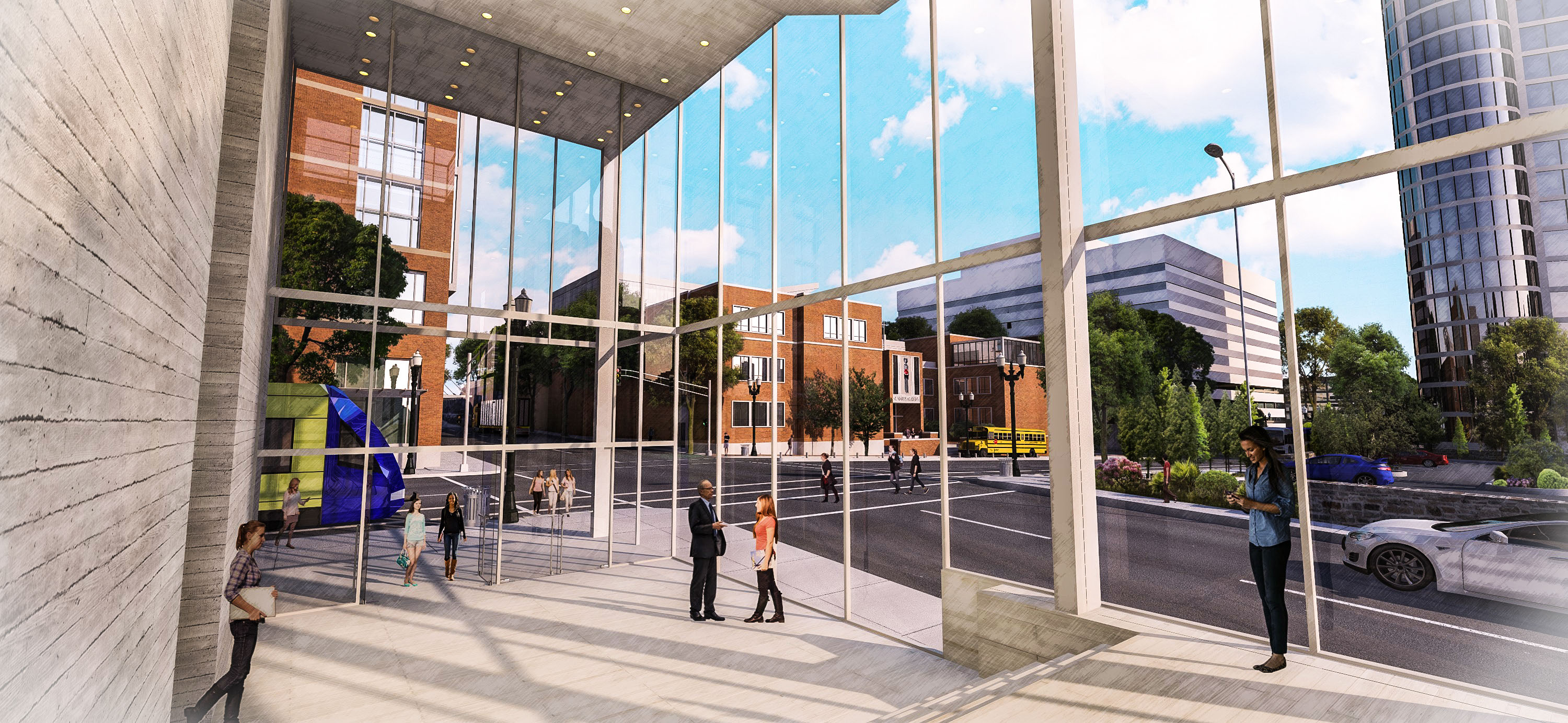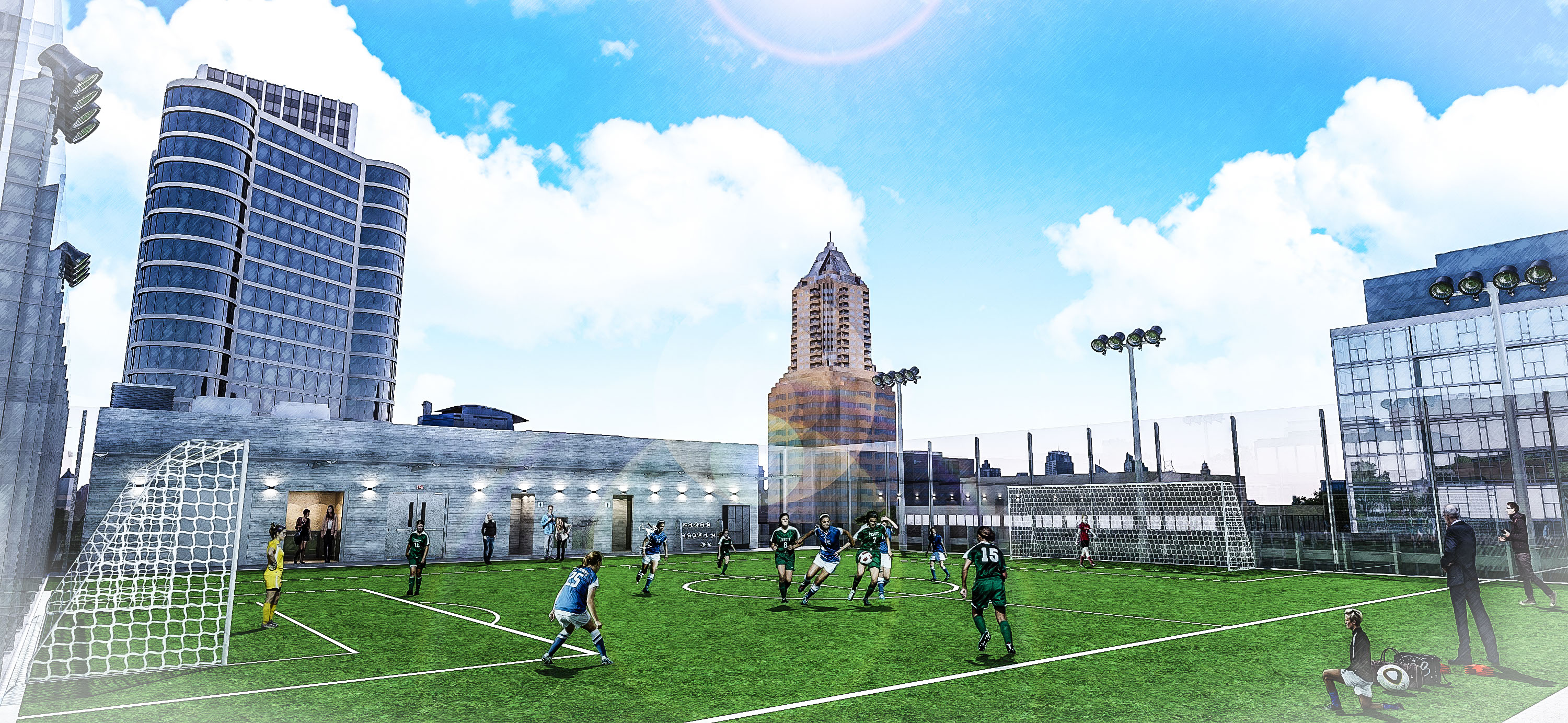 Our design places what one might consider the main attraction, the gym, at the top on the sixth floor. Atop the gym, the track, running around the structure’s edge overlooking the hardwood. And at the roof, the outdoor field enwrapped in a glass fence. This allows for smaller rooms below to support the clear span needs of the larger ones above and keeps structural costs well in hand. Directly below the gym will be all athletic support space: Team rooms, locker rooms, training rooms, etc. Below those to the ground will be office space followed by below-grade parking to service athletic events. To solve the challenges of connectivity and facilitate our campus we site the circulation system nearly entirely at the building’s edge. Enveloped in glass our stairwell and elevator system sit directly kitty-corner to St. Mary’s existing site, so no matter which floor, one’s transitions will always, by sight, reference the connection between the two blocks.