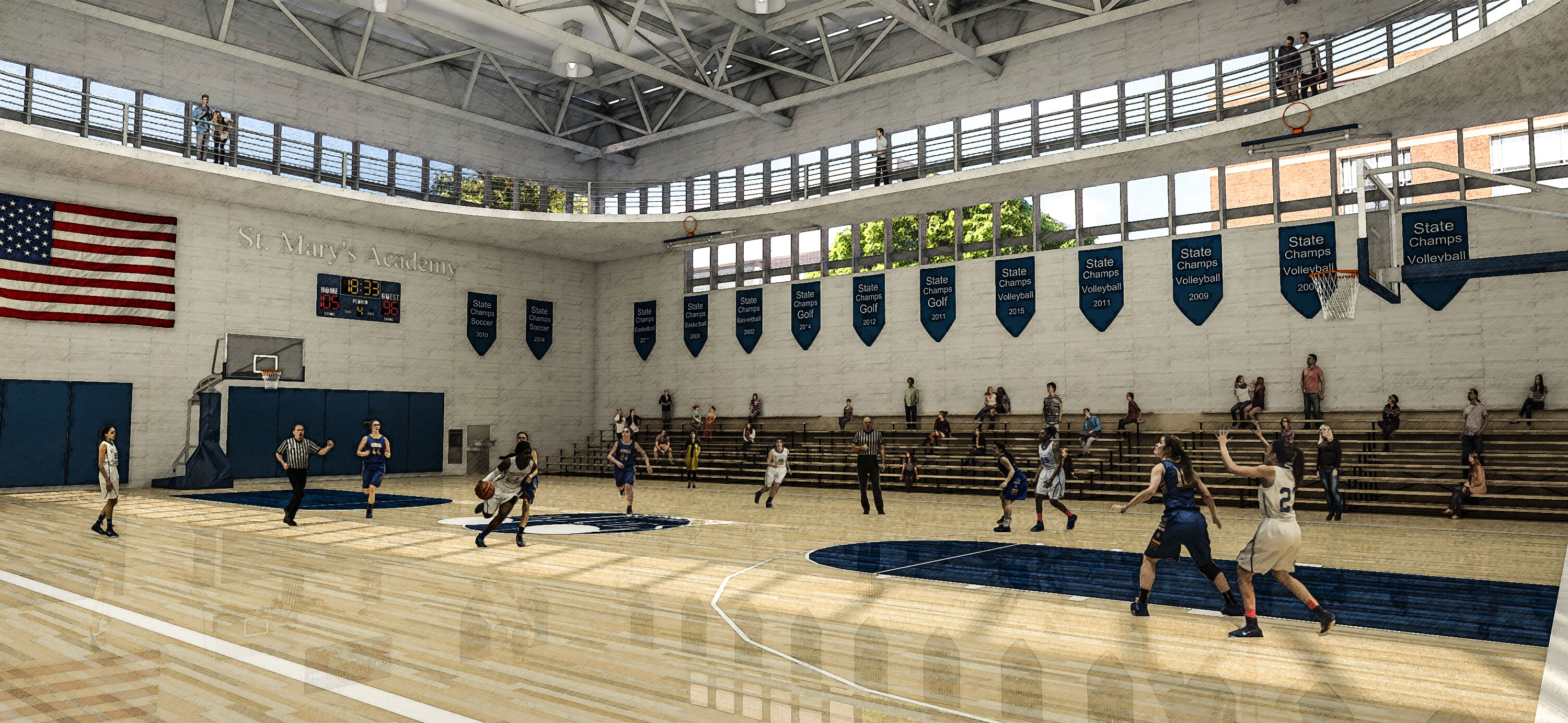The idea was to take all athletic and administrative activities out of St. Mary’s existing structure and move them to an adjacent block. This presented a number of fun architectural challenges. To start, how do you fit a gym, track, outdoor field, locker and training rooms, and offices into an up-and-down structure? And once we do that, how do we solve the most exigent challenge of campus: connectivity?